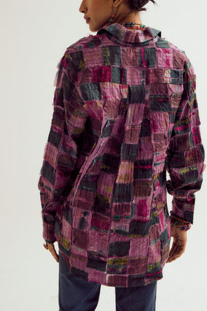 • A vibrant front-open shirt in ecru, showcasing artisanal patchwork accented with intricate thread embroidery. A versatile piece that adds a handcrafted touch to both casual and elevated looks.