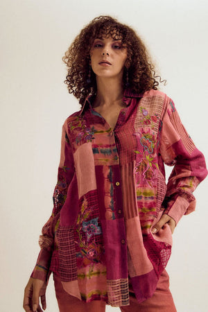 • A front-open shirt crafted in a harmonious blend of jute, linen, and habutai silk, featuring delicate floral patchwork embroidery. The textured fabrics and soft fuchsia hue make it a statement piece that’s both artisanal and effortlessly wearable.