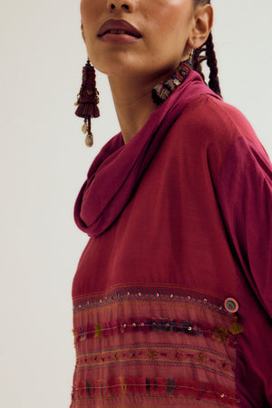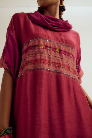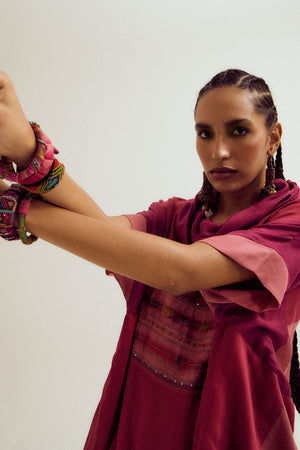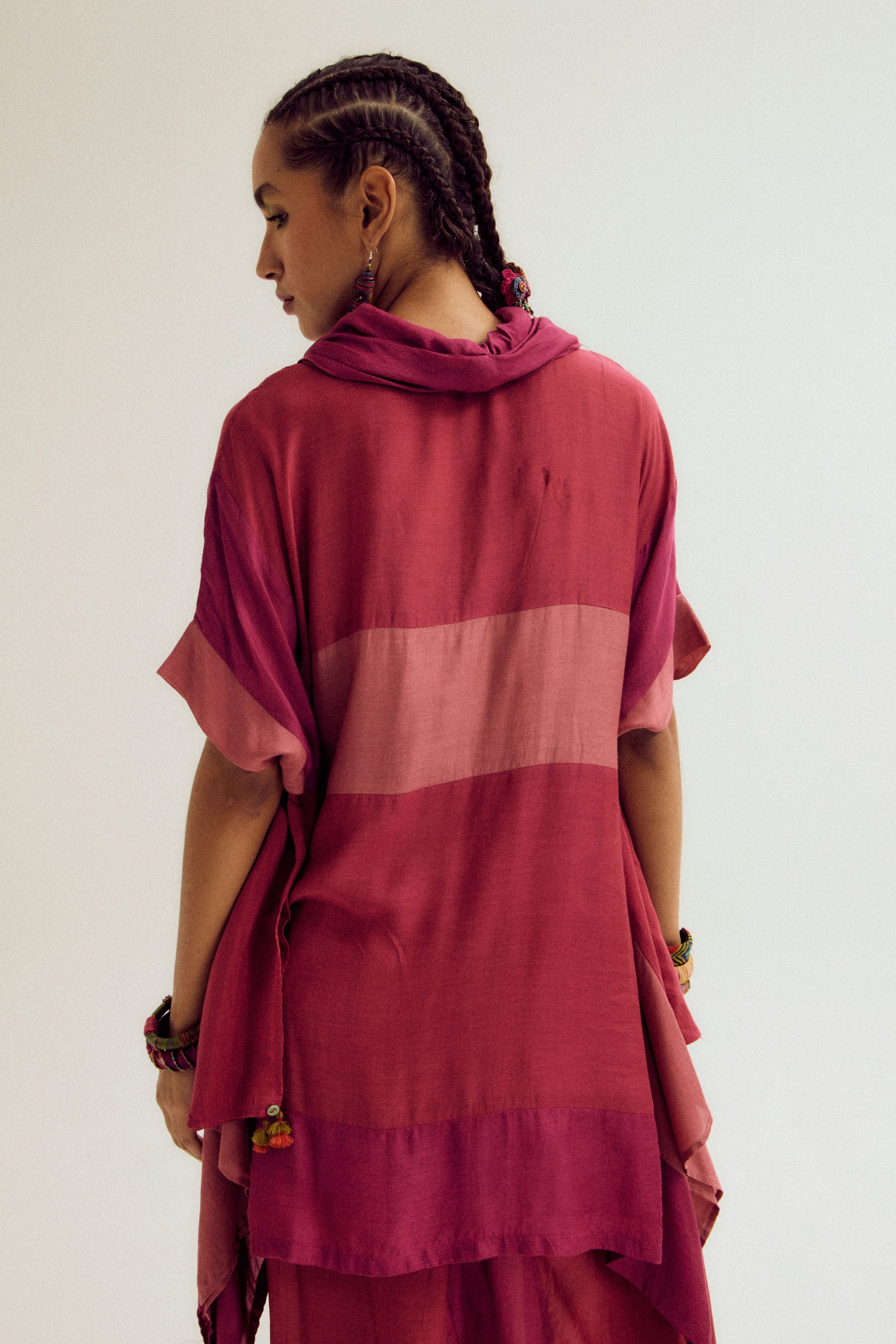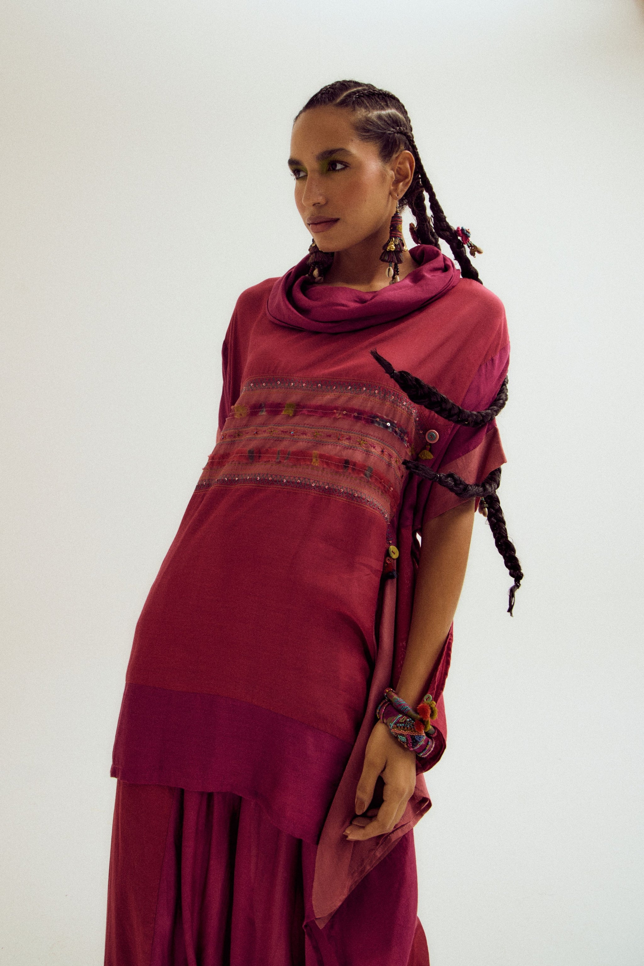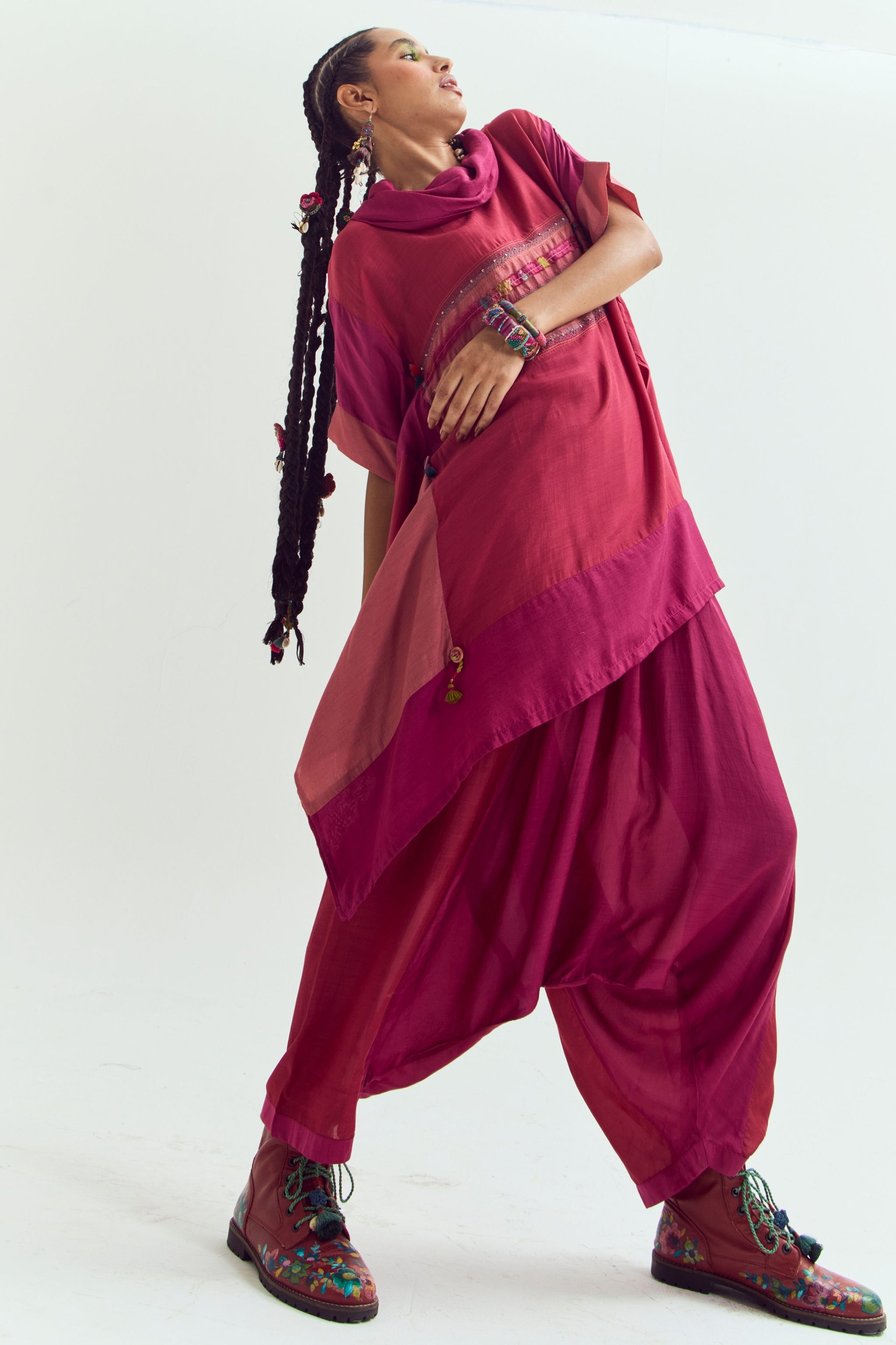 • A striking two-tone ensemble that fuses bold color play with artisanal detail. The uneven color-block shirt features a turtle neck, delicate embroidery, and tassel accents for a refined yet playful touch. Paired with fluid dhoti pants designed with a structured front belt and comfortable back elastic, this set offers effortless elegance with a modern twist.
