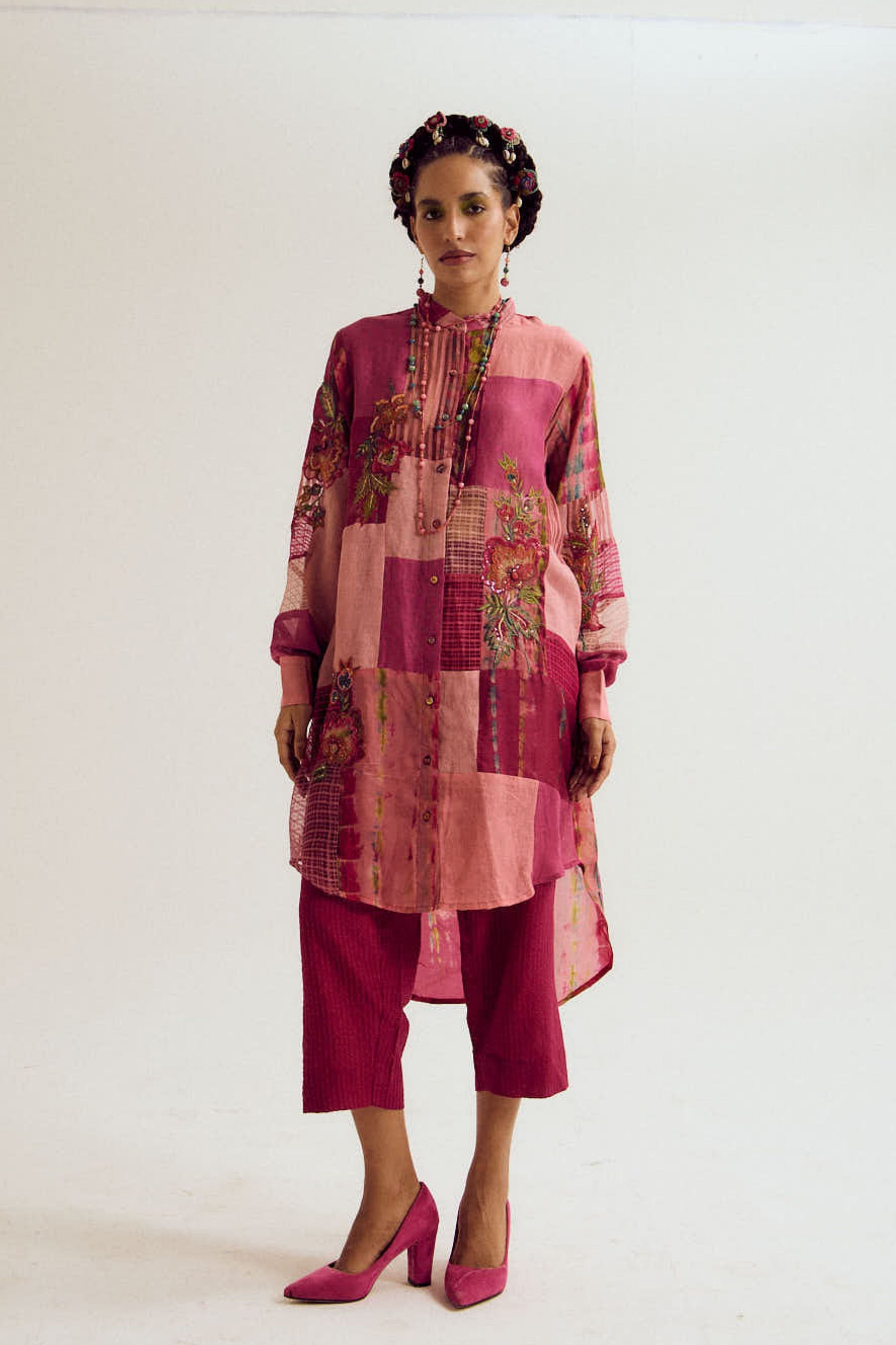 • A front-open patchwork hi-low long tunic shirt featuring a band collar, paired with an inner for added comfort and style.