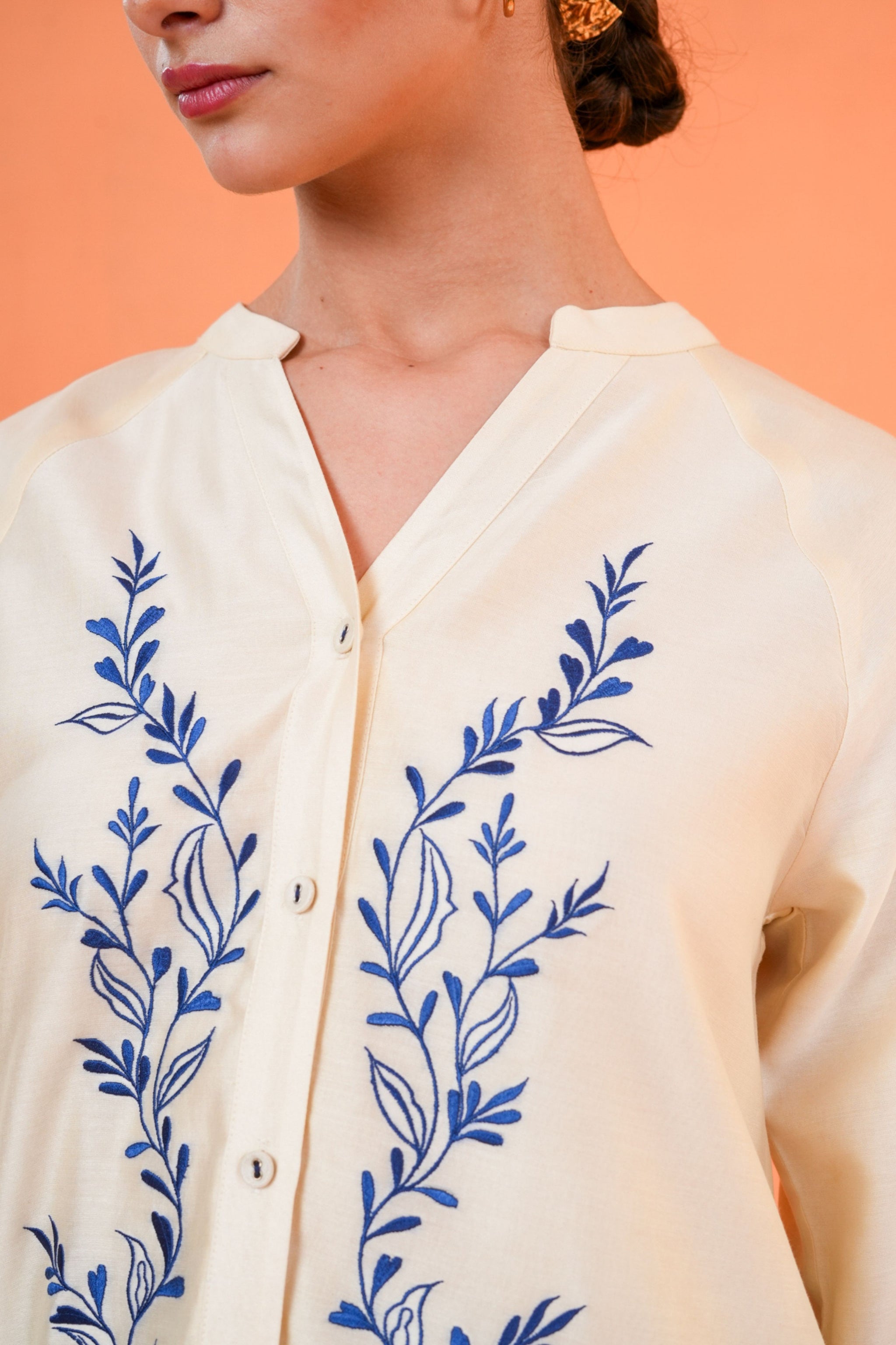 • Ivory and blue chanderi silk co-ord set highlighted with delicate resham thread embroidery, paired with contrast pants