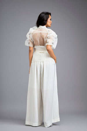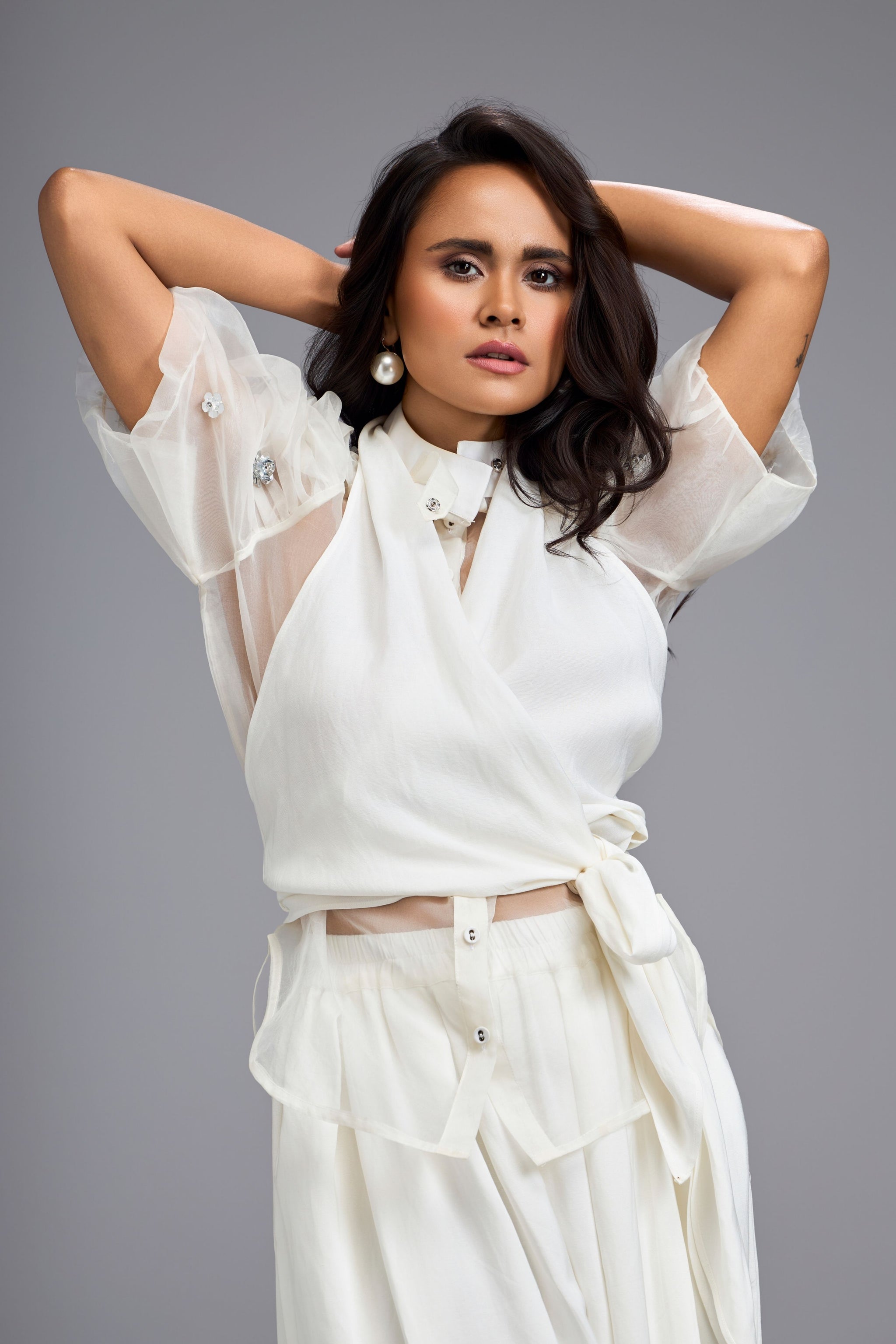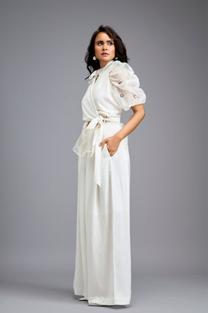 • A dramatic wrap-around waist tie and high-neck collar with sheer, voluminous sleeves with textured flower appliques. The blouse is paired with wide-leg trousers.