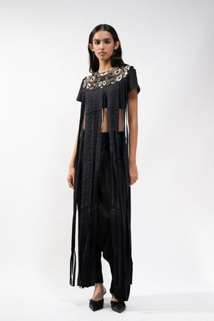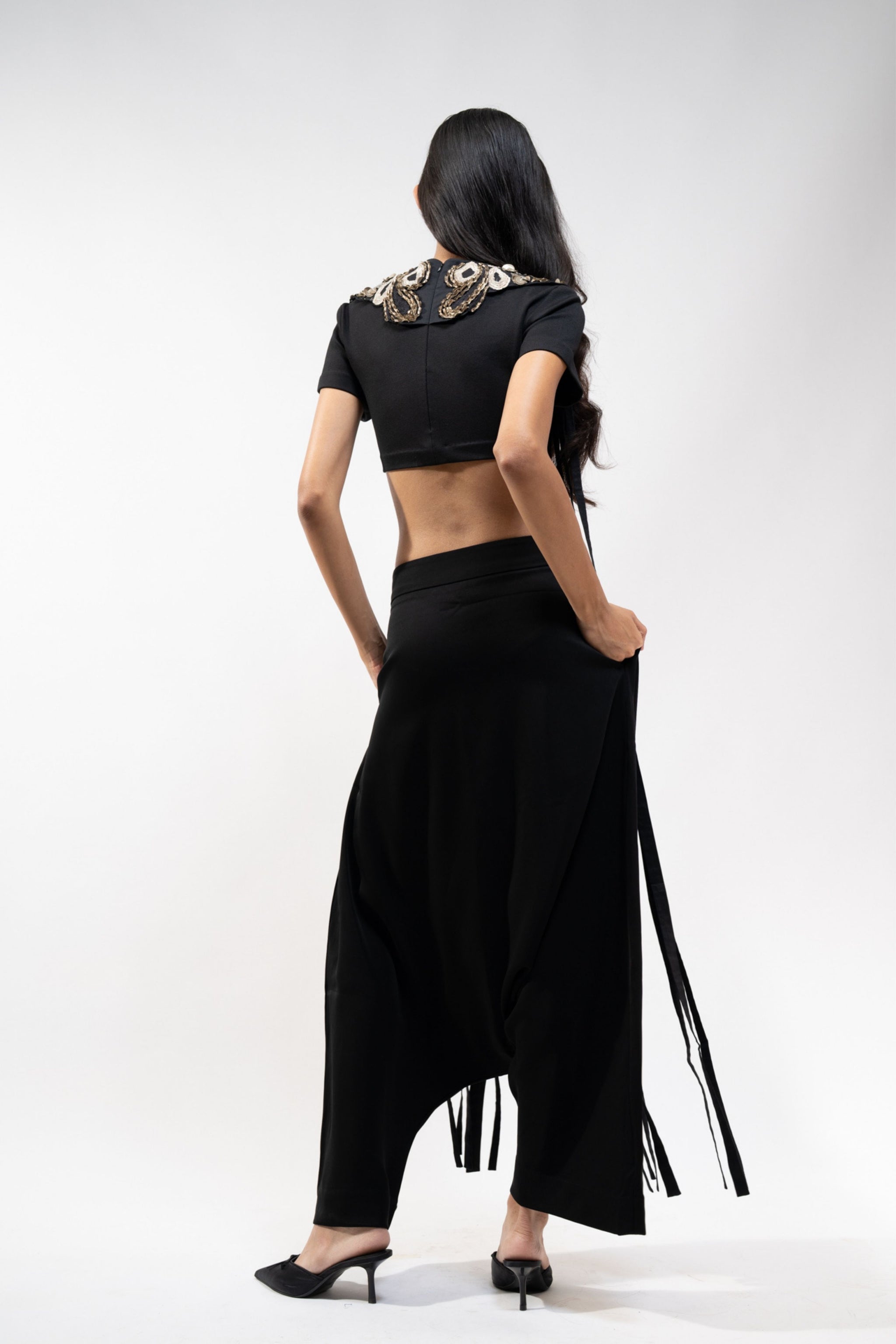 • A striking embroidered crop top with playful fringes, styled with flared trousers for maximum impact.