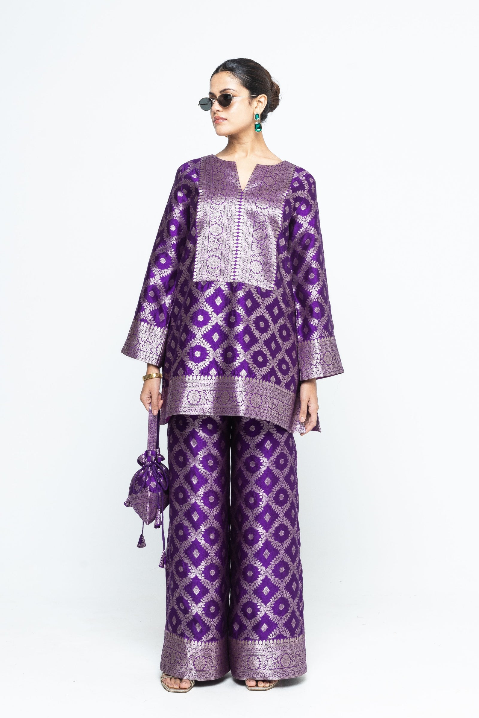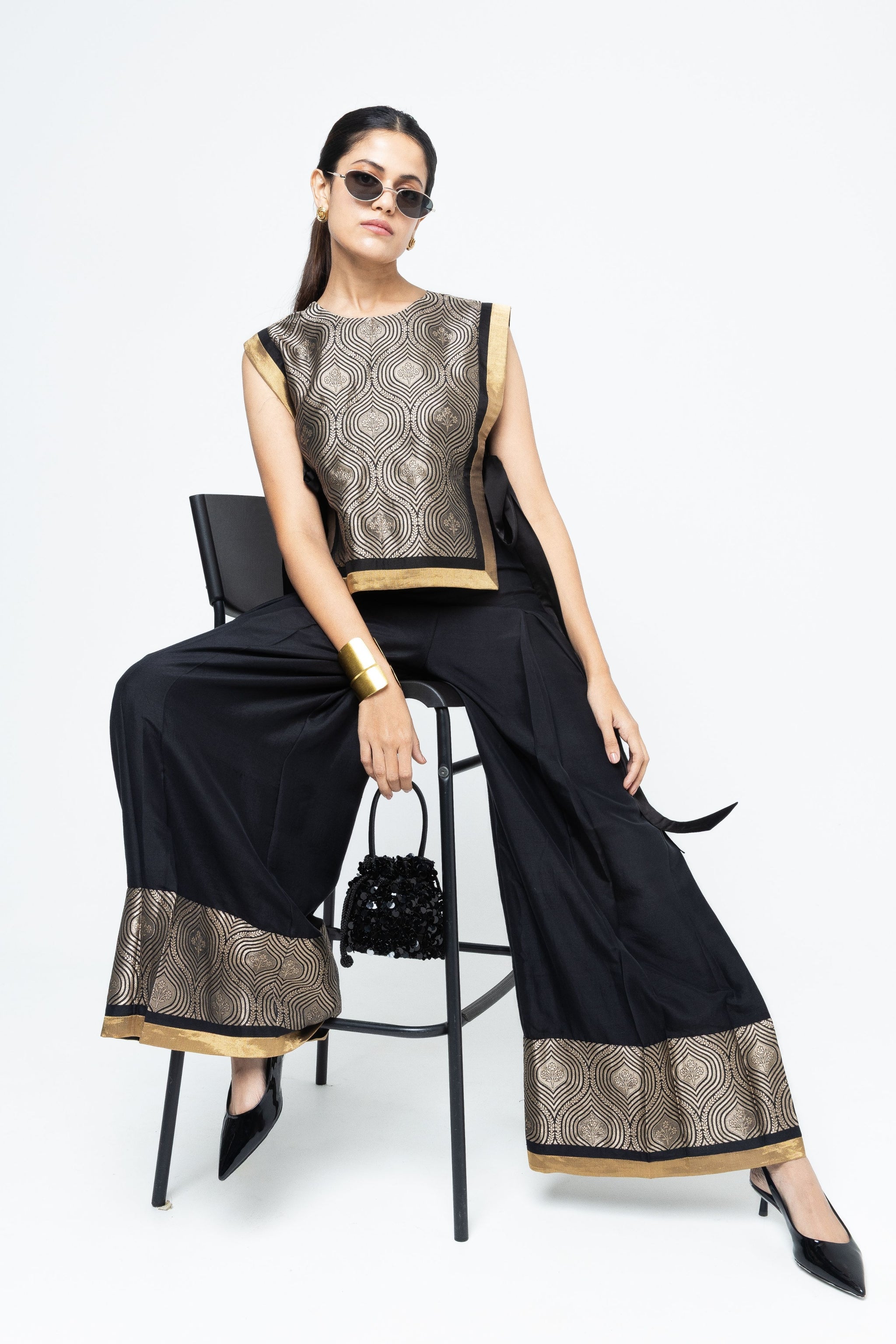 • Statement scallop brocade bib with tie detail paired with box pleated silk pants with brocade detail.
