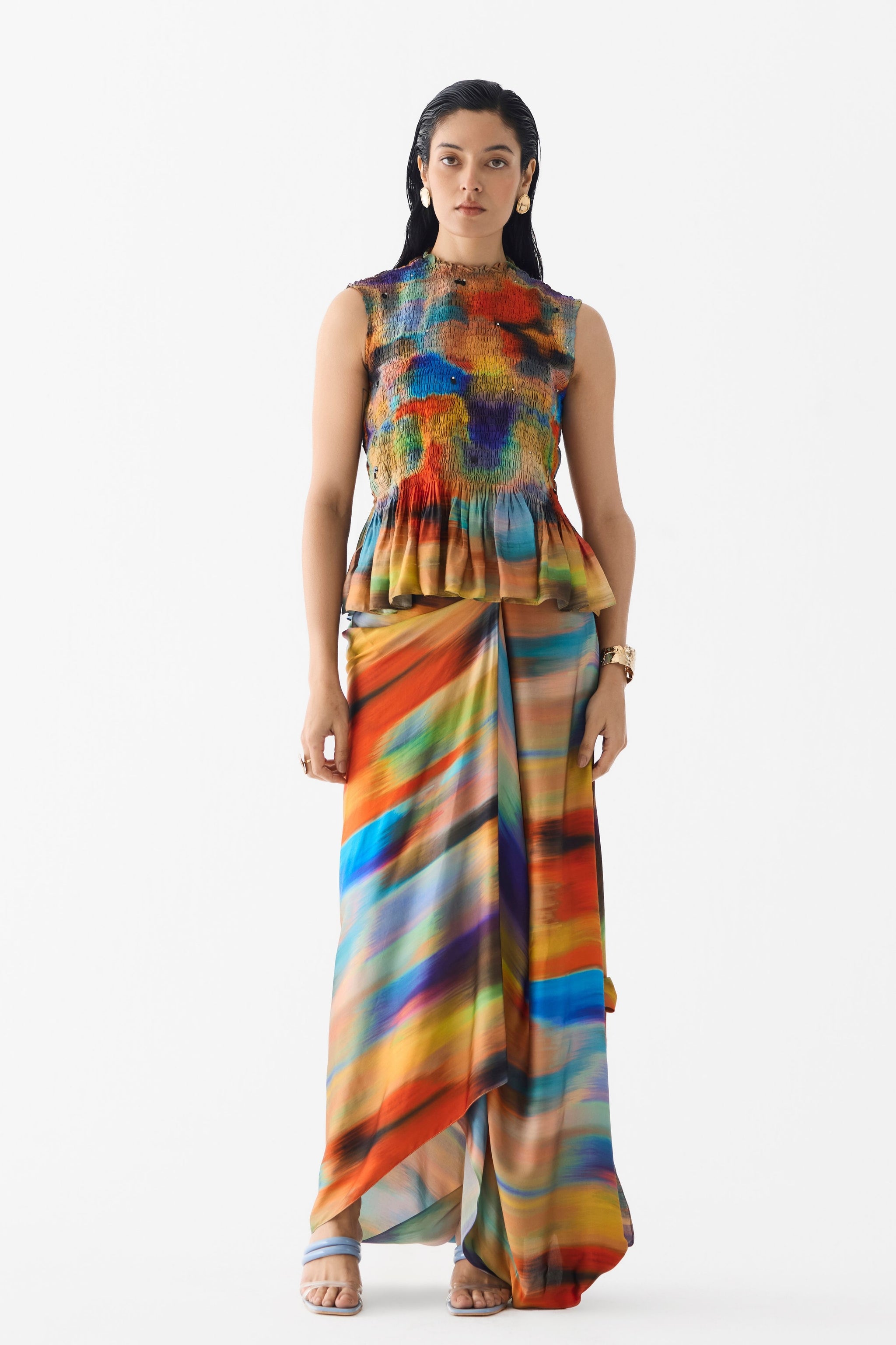 • The Night Queen Kurta Shirt & Pants crafted from our stunning vegan silk fabrication, trans-seasonal, is a statement piece. This two piece set, printed in our brushstrokes print resembling a night queen flower, has a chic look. The top has been ruched and is sleeveless with a peplum fit. It is hand embroidered with sequin and stones. It is paired with our matching night queen knot skirt with a side zipper.Wear it with heels for an elegant look. The model is wearing a Size S and is 5'8.