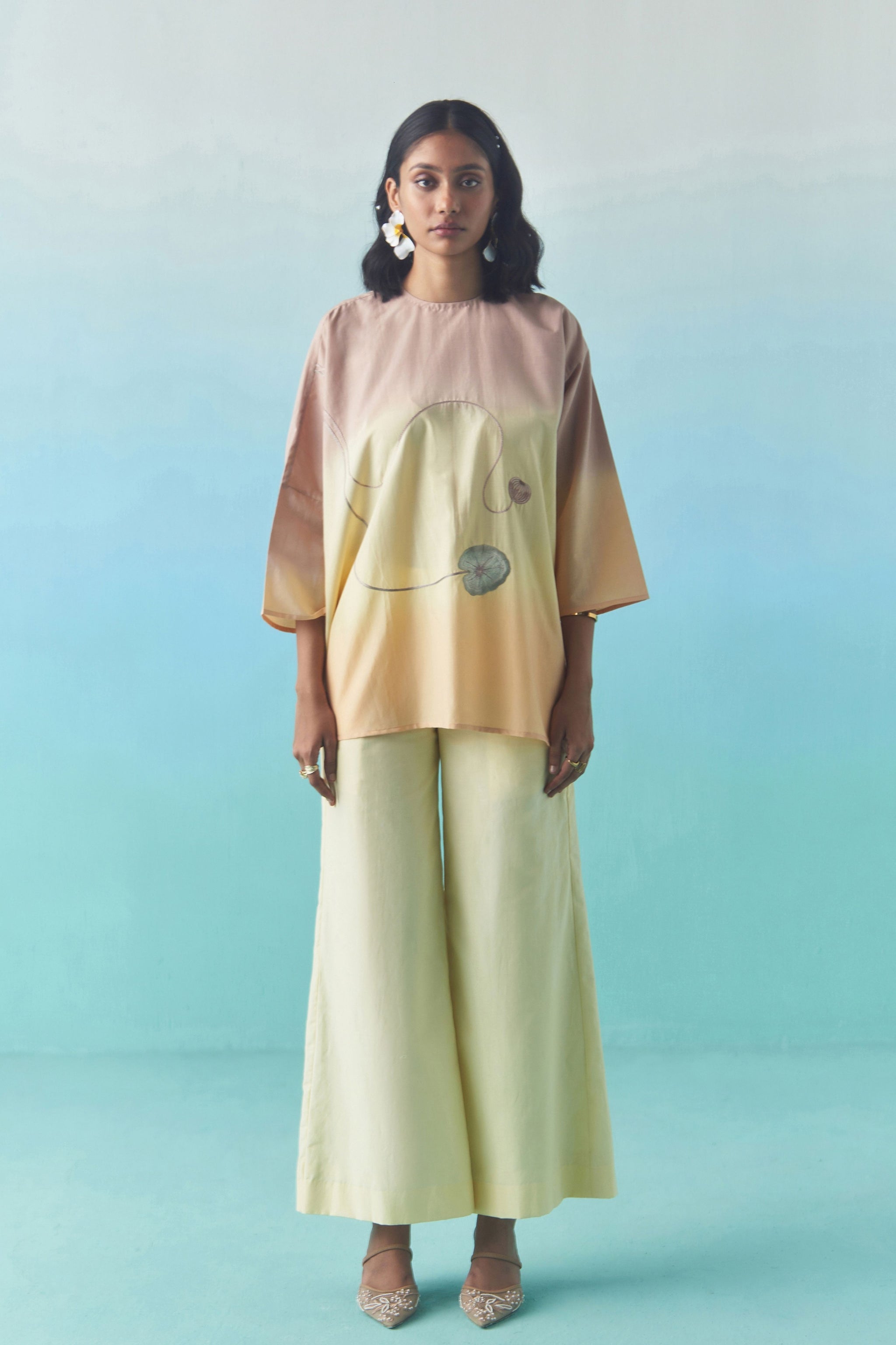 • A holiday favorite, the co-ords feature an anti-fit top in shades of sunset, embellished with pastel motifs and a pair of solid wide legged trousers