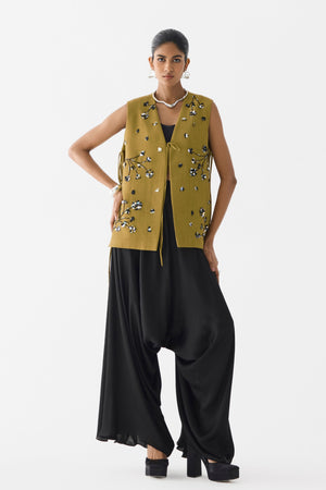 • The Tiger Lily Vest & Dhoti Pants crafted from our stunning linen & vegan silk fabrication, trans-seasonal, is a statement piece. This two piece set, has a hand embroidered tiger lily all over. The embroidery is done with sequin and beads. Sleeveless with side knots, this vest has a v-neckline and front knots. It is paired with our contrast dhoti pants in vegan silk in an black colour. Wear it with heels for an elegant look. The model is wearing a Size S and is 5'10. * It does not come with an Inner. Please email/whatsapp us if needed.