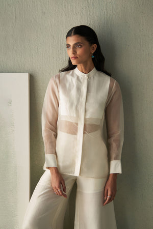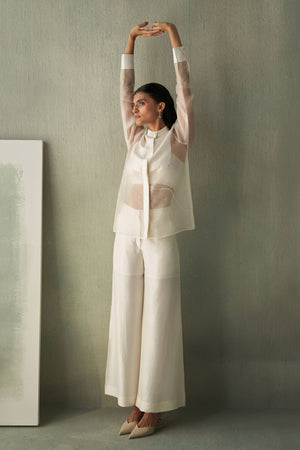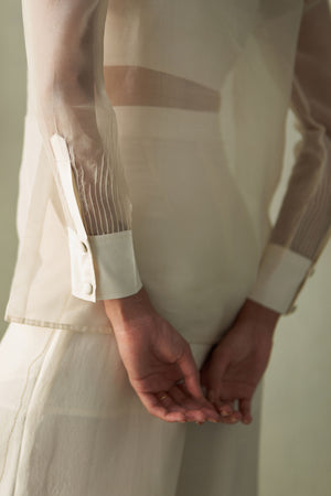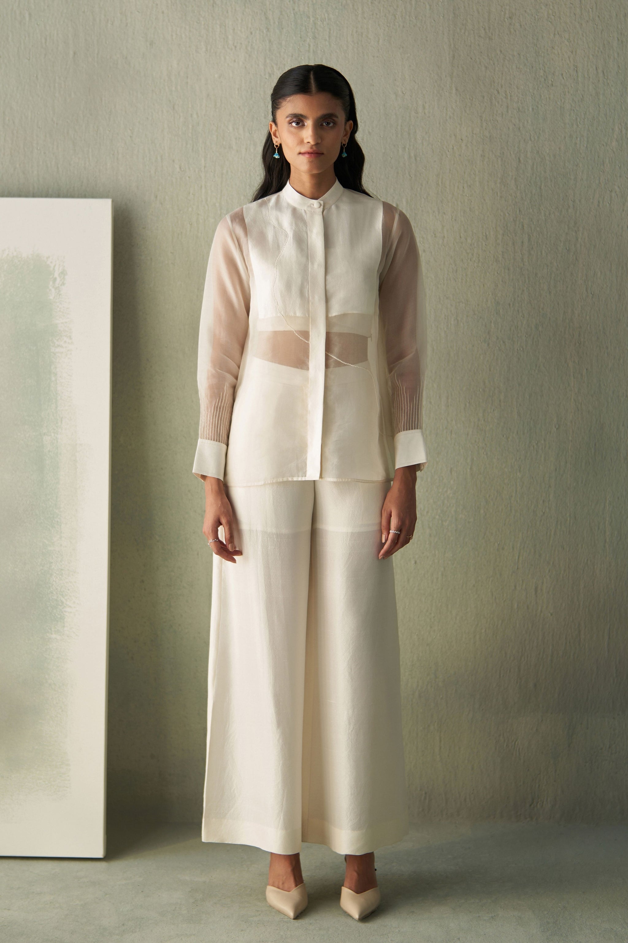 • A vision of quiet sophistication, this silk set features a sheer organza shirt with delicately pintucked cuffs and french knot detailing, paired with fluid wide-leg silk trousers. The tonal ivory palette and minimal construction evoke effortless serenity— perfect for refined, contemporary dressing. It comes with w bustier inside.