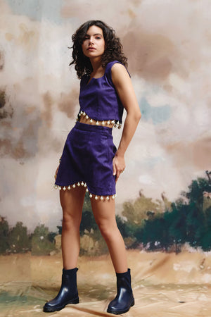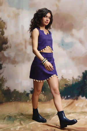 • This two-piece outfit features a sleeveless top, in suede distinguished by its unique neckline that draws the eye. The matching skirt's structure is tailored for a sleek fit, offering a modern look, complements the top, creating a unique silhouette. Both pieces are exquisitely adorned with a delicate line of small and big white pearl embellishments along the hemline, adding a touch of refined detail.