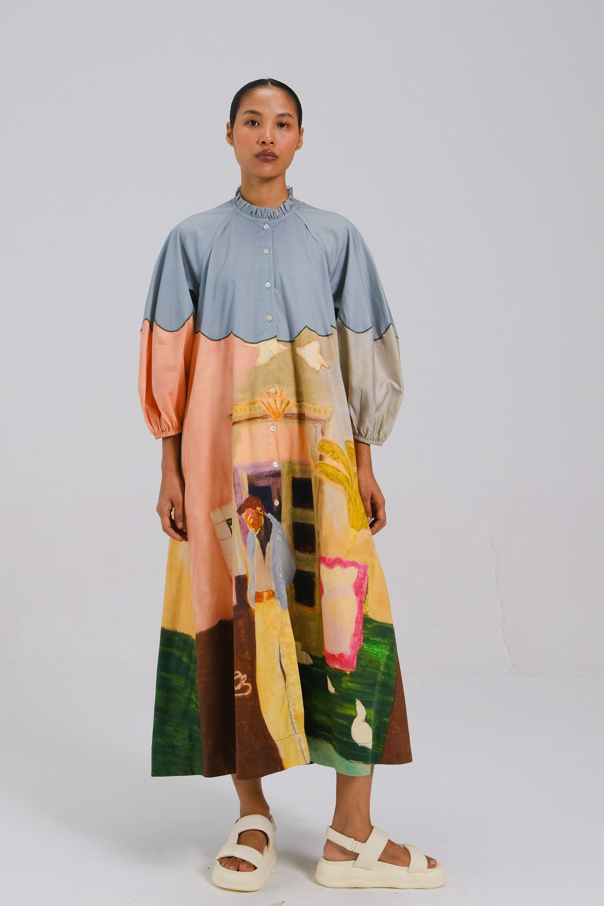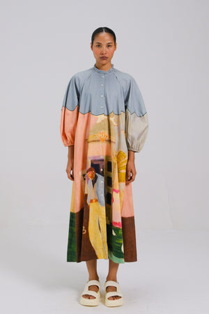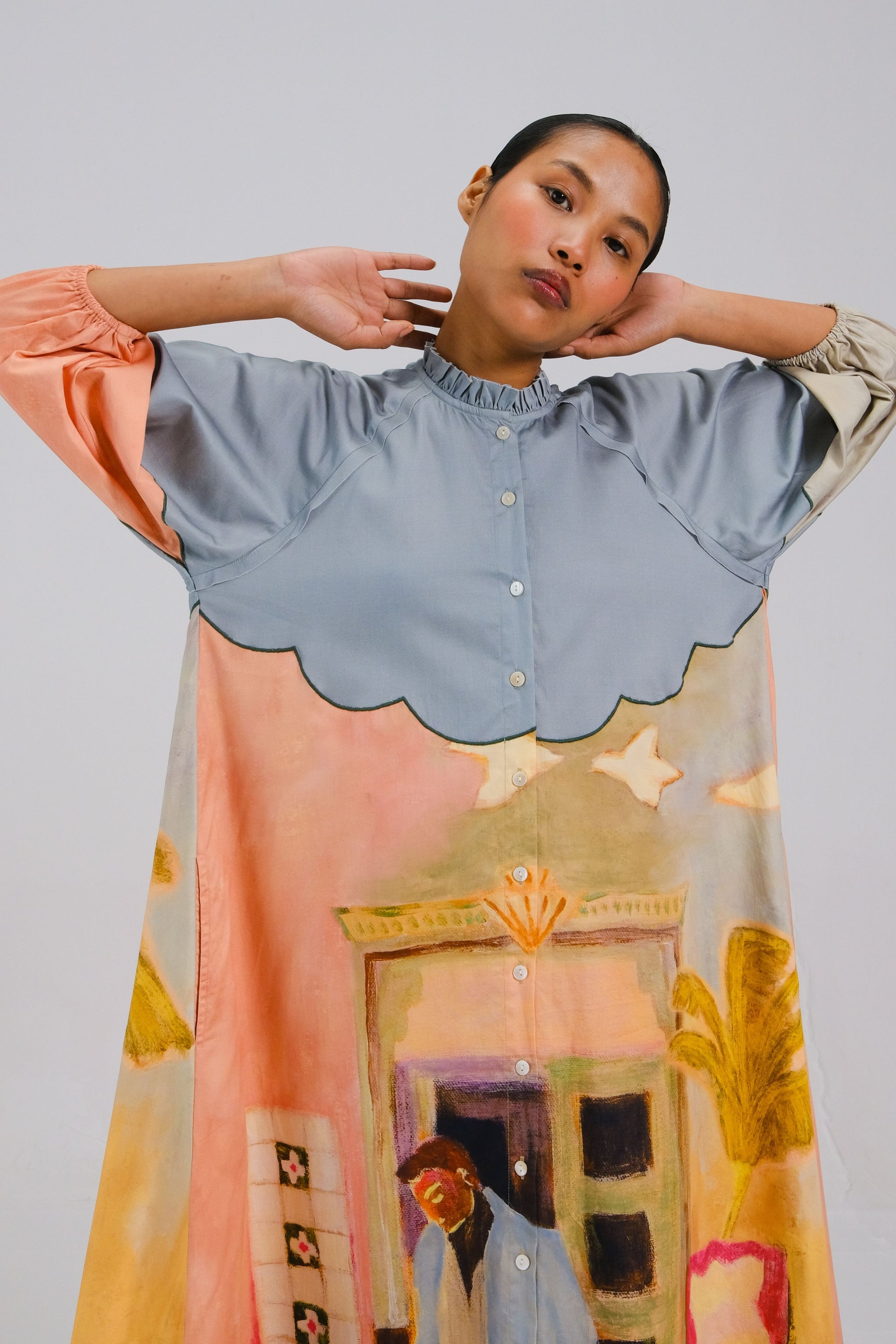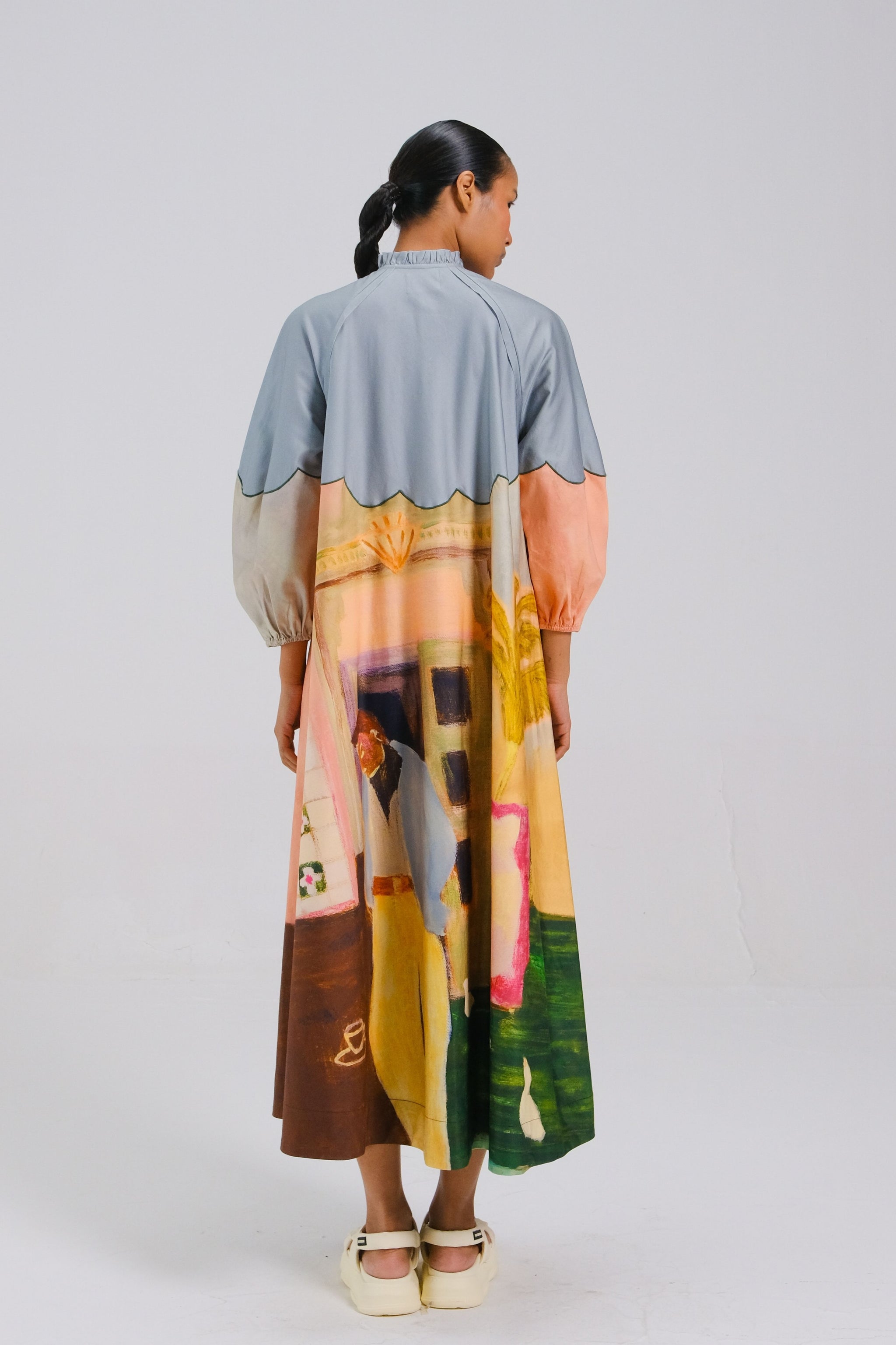 • The deuce dress in morning coffee is shaped in a relaxed silhouette that blends comfort with considered detail. Featuring soft raglan sleeves in a three,quarter length, it carries an effortless drape and ease of movement. Scalloped color blocking and a gently ruffled collar add a subtle, artful finish, expressive yet refined, and thoughtfully designed for everyday elegance.