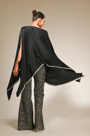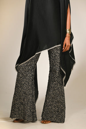 • Satin asymmetric kaftan paired with cutwork floral semi fitted bottom