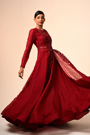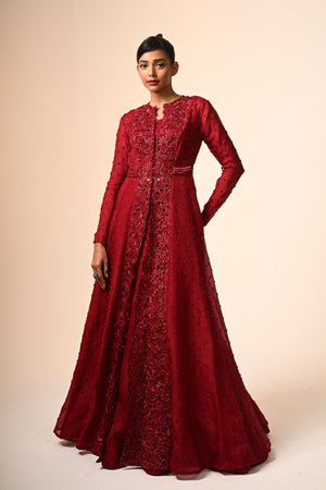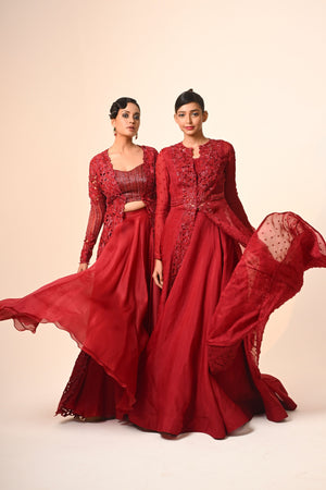 • Floral cutwork jaal panelled jacket with pearls cheetahs on kali paired with organza skirt and bustier with narrow border on hemline