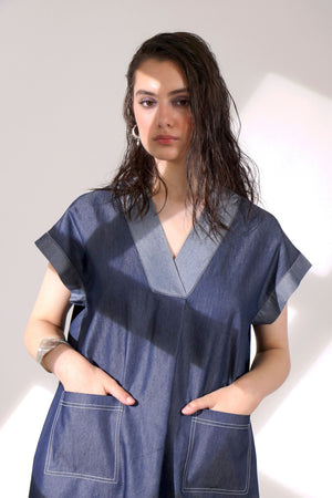 • Designed for everyday ease, this denim dress features a flattering v-neck with contrasting panels on the neckline and sleeves. Thoughtful topstitched pockets add a touch of functionality, while the relaxed silhouette ensures all-day comfort. A perfect blend of style and practicality, it's a go-to piece for effortless dressing.