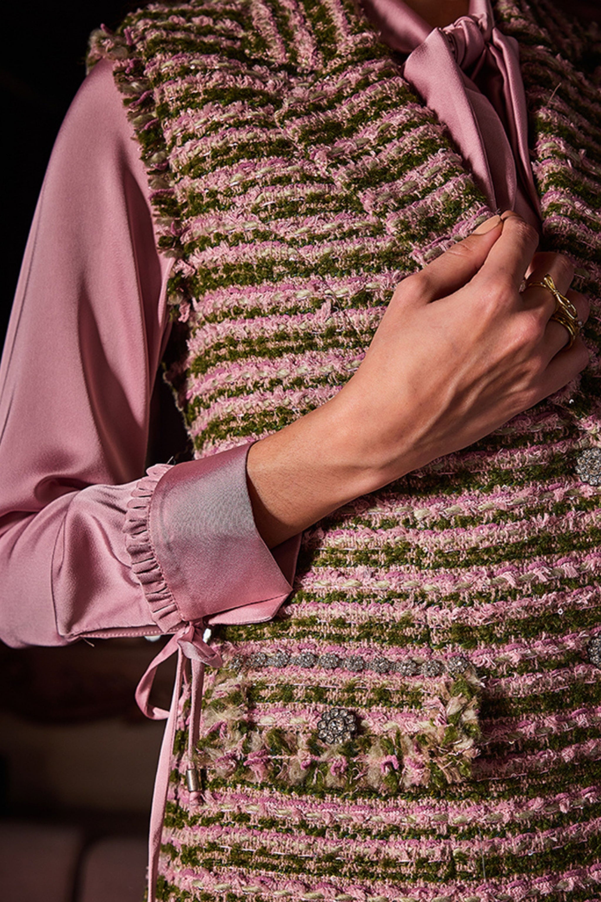 • This ensemble features a longline relaxed-fit blazer with a front opening and metallic buttons, a sleeveless silhouette, and metallic/crystal-detailed pocket flaps, paired with a bow-tie satin dress designed with a neck tie, full sleeves with ruffle cuffs, and a pleated bottom. Model's Height : 5'8'