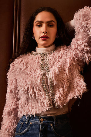 • This relaxed-fit cropped jacket features full sleeves, a front hook closure, and intricate crystal and bead embellishments for a chic, elegant look. Model's Height : 5'8'