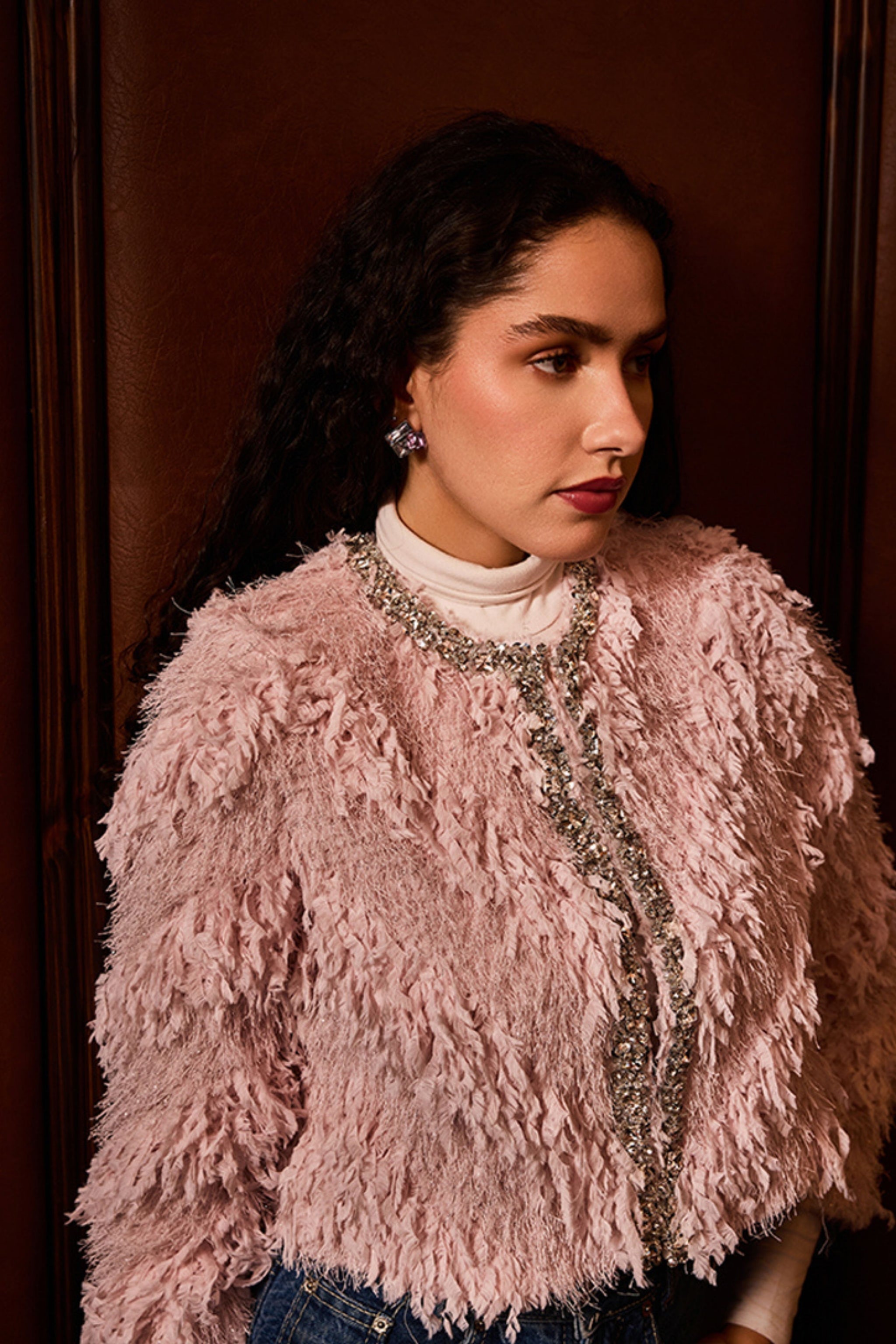 • Fabric: Faux Fur Fringe Fabric, Flowing Satin