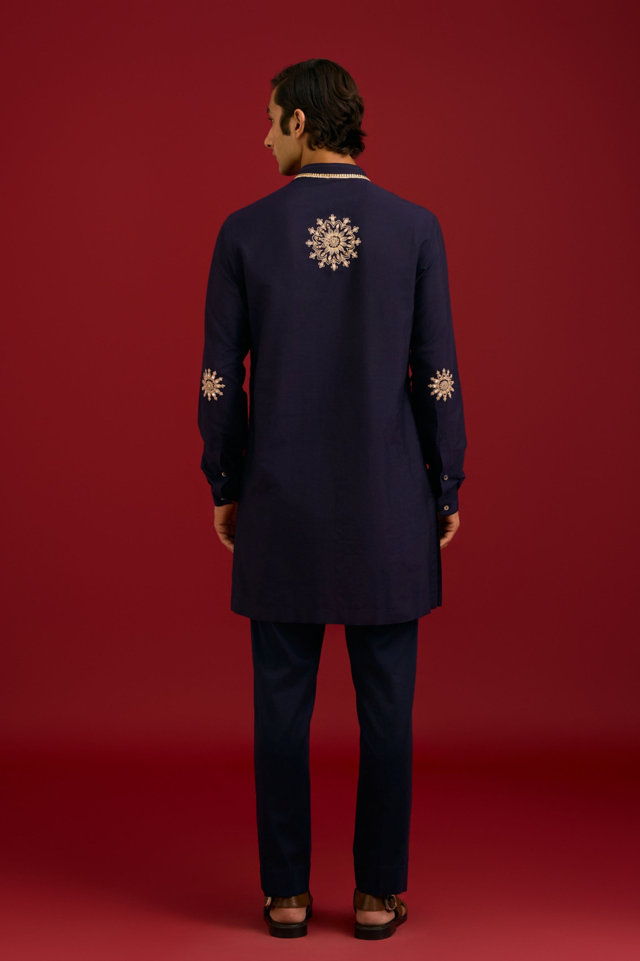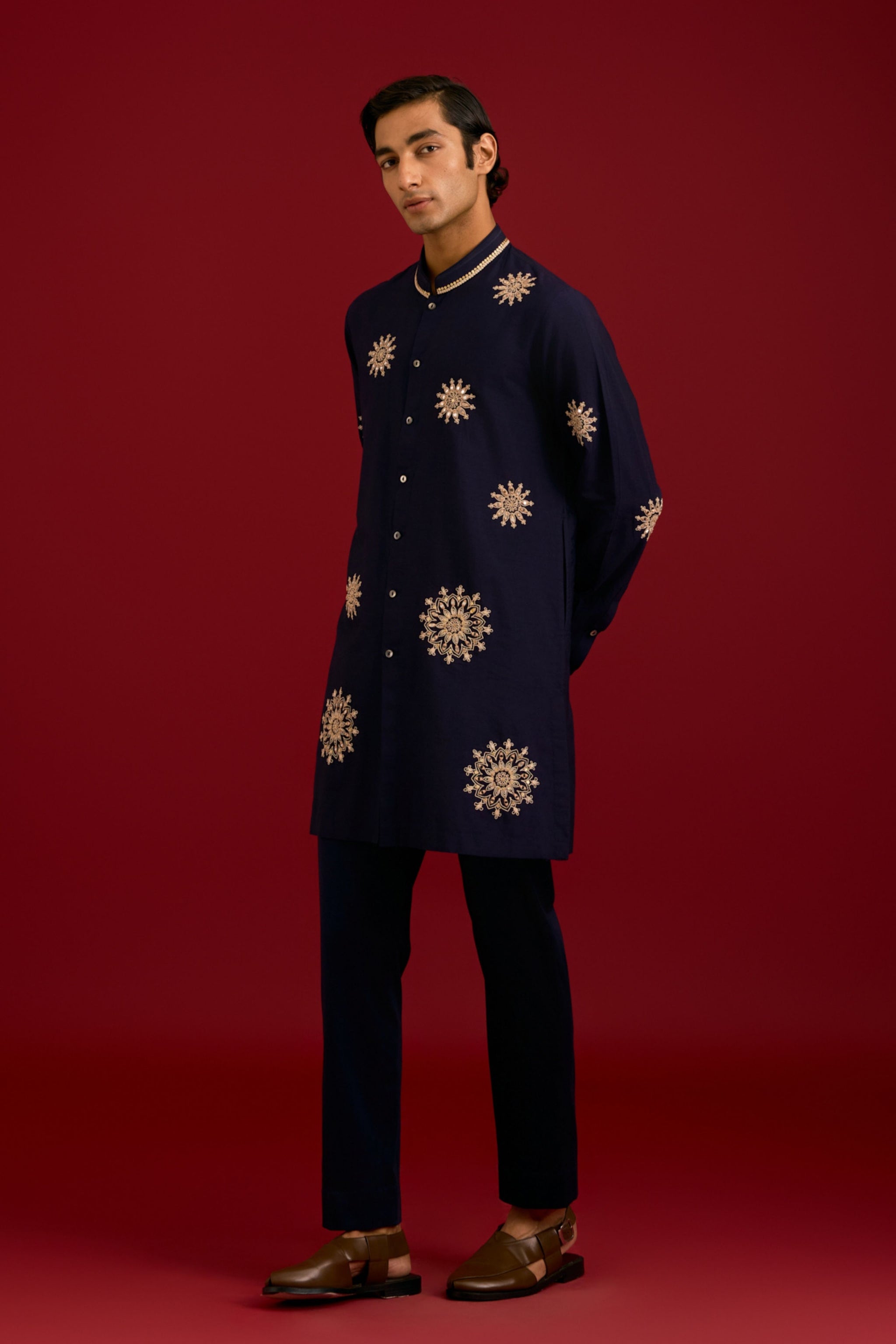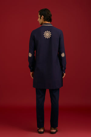 • Rich navy tones come alive in this stunning front-open kurta set, crafted from a luxurious cotton silk blend. The kurta features intricate mirror work, sequins, and dori embroidery, adding a touch of sophistication and elegance to this classic outfit. Paired with a matching slim pant, it exudes timeless style and poise.