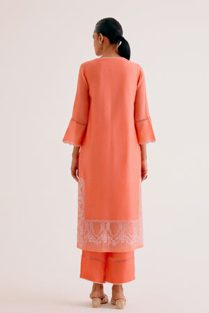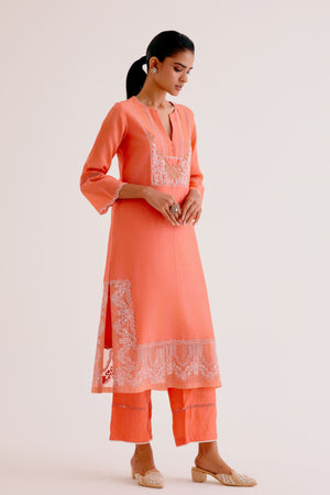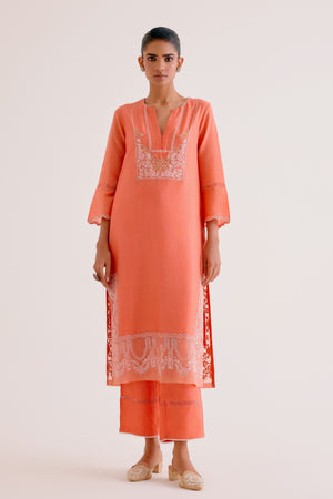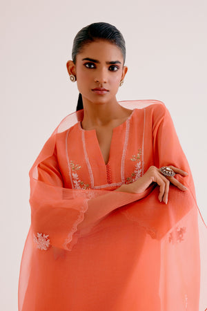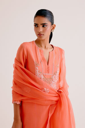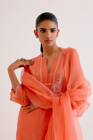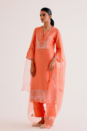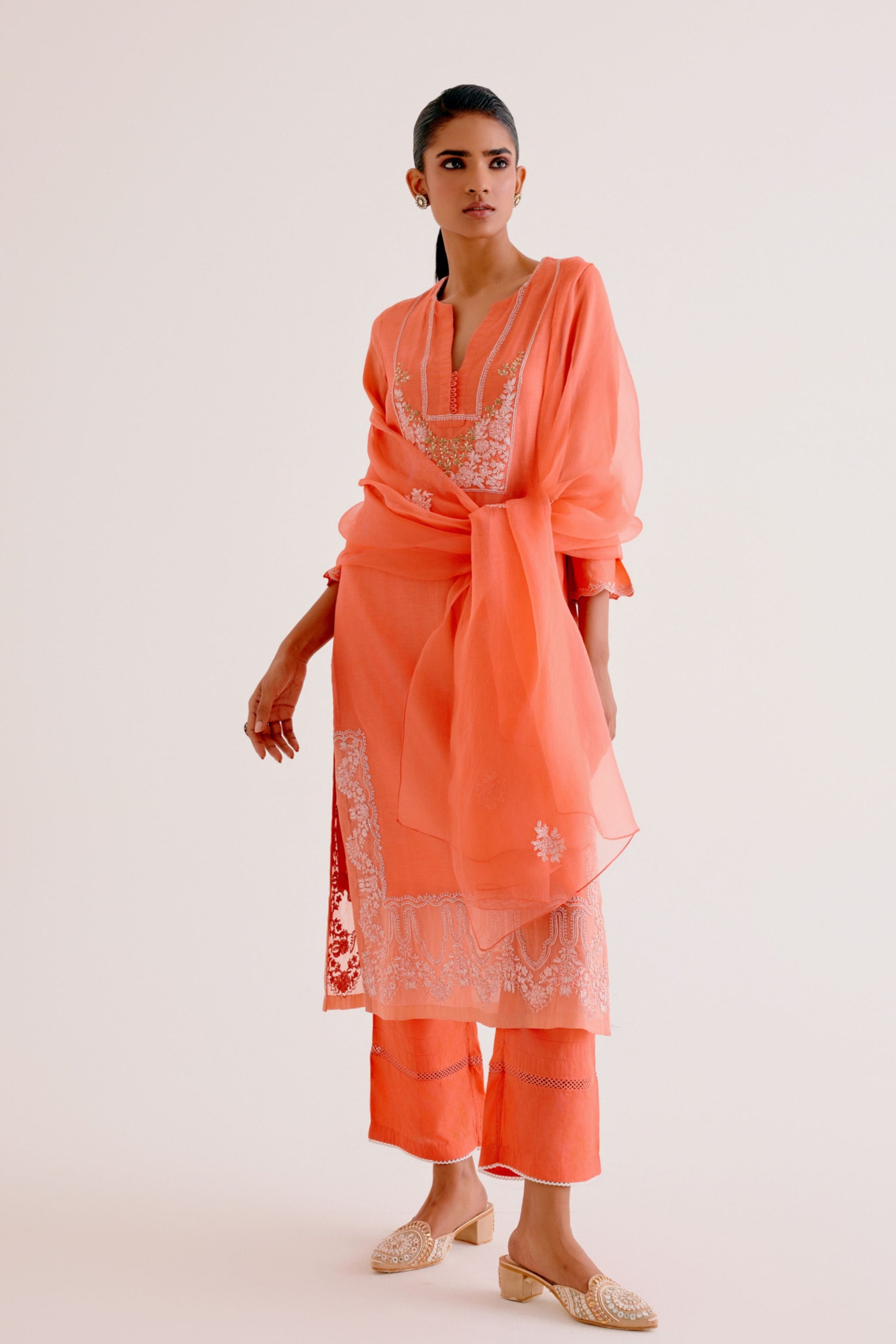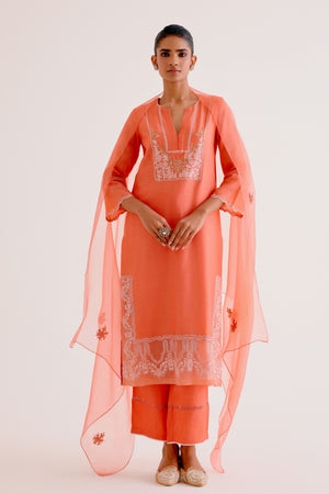 • This exquisite ensemble features a beautifully crafted orange kurta adorned with intricate dori and sequins embroidery. It is paired elegantly with matching silk chanderi palazzo pants and a sheer silk organza embroidered dupatta.