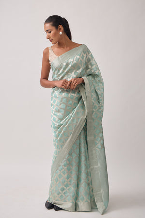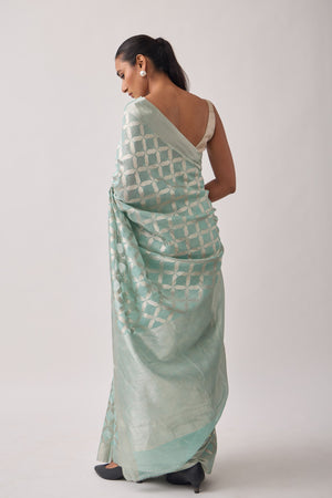 • Chanderi tissue saree: handwoven with intricate silver zari kadwa jal