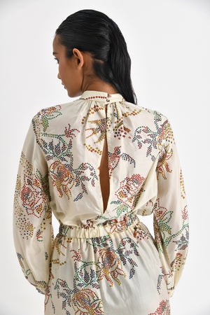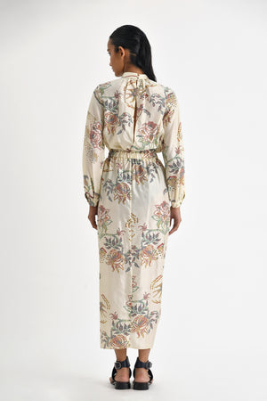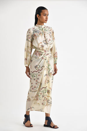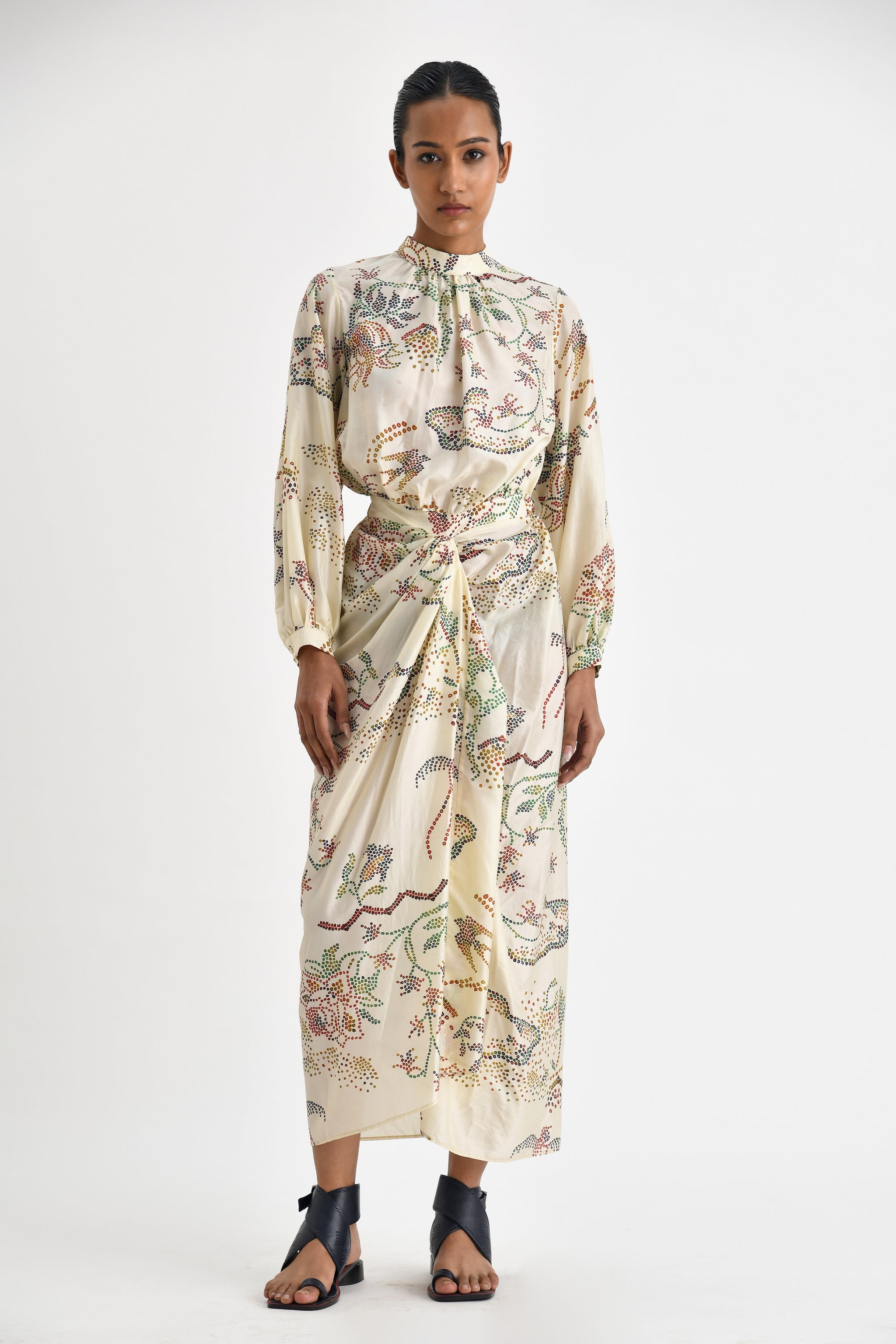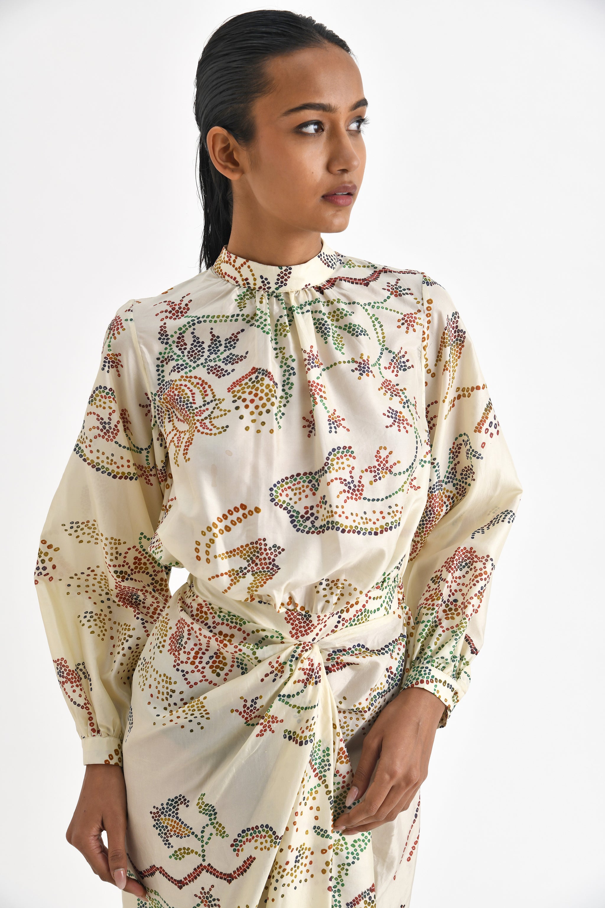 • Polo neck waist knotted dress, with a back slit and buttoned cuff sleeves. The lightness of this style keeps you comfortable throughout the day. Style it with hoops and your favourite sandals.