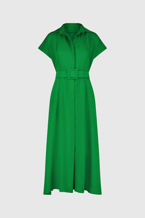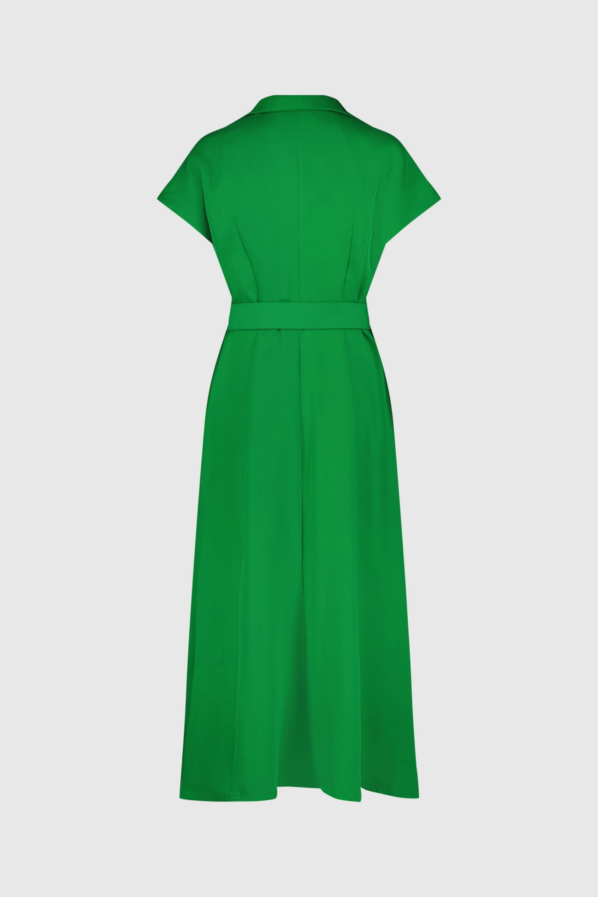 • Crepe fabric (100% polyester)fully lined with collared neckline with buttons and hidden button placket. Drop shoulder sleeve with a a-line silhouette belted waist seaming accents