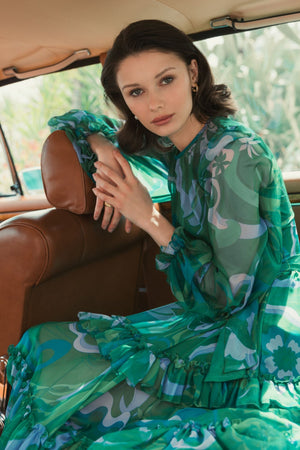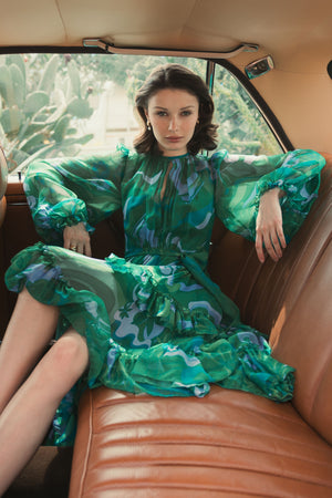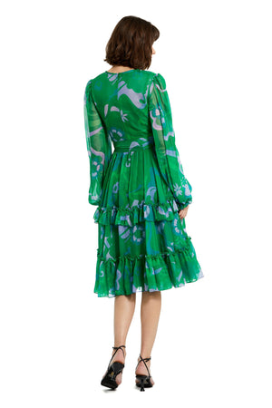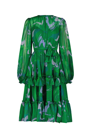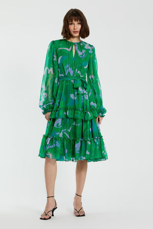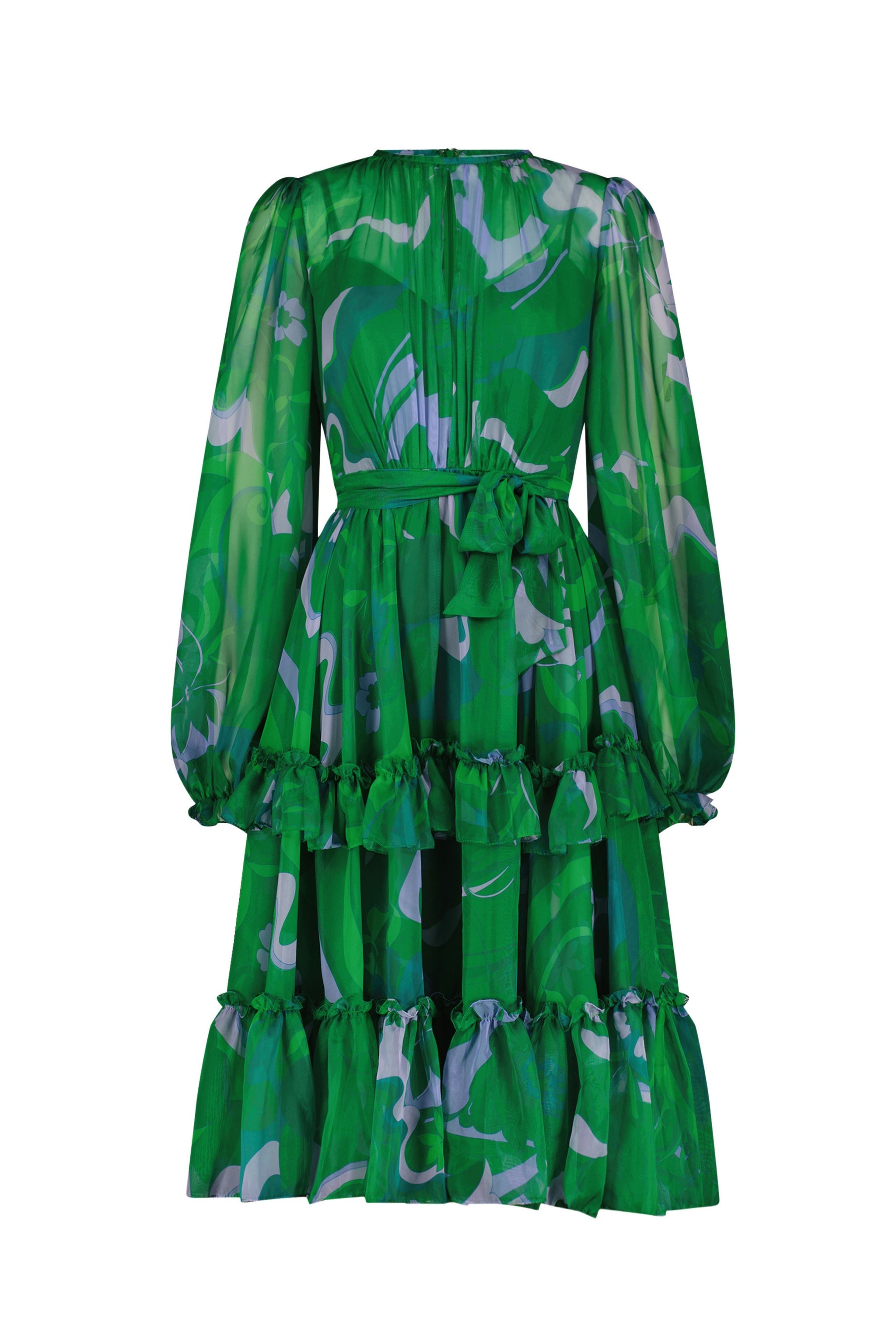 • Chiffon fabric (100% polyester)fully lined body; unlined sleeves,high neckline with keyhole cutout long bishop sleeve ruffle tiered skirt tied bow detail on waist concealed back zipper