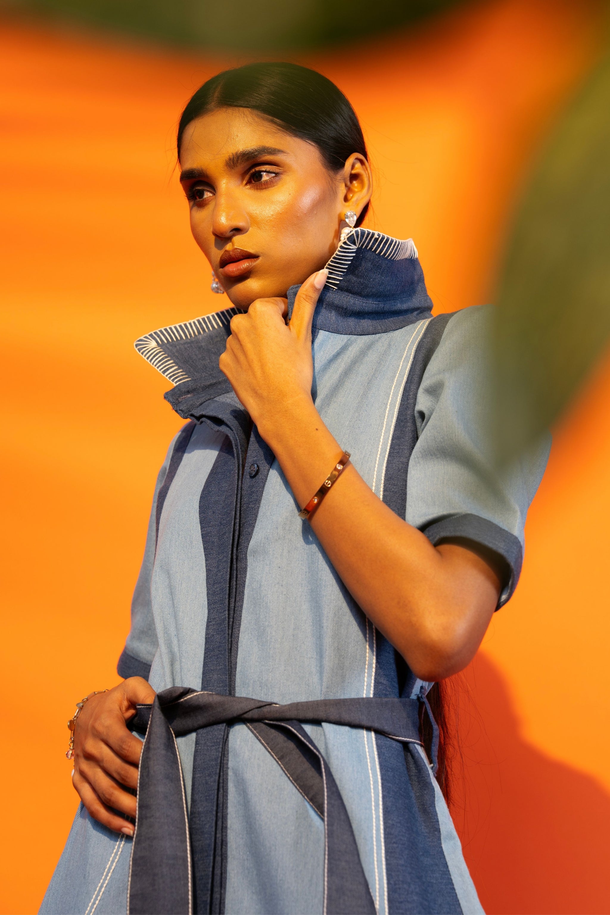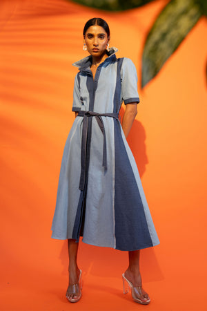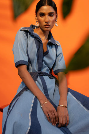 • Bold, refined, and effortlessly modern — indigo orbit is a statement dress that plays with symmetry, structure, and shades of denim. Crafted with alternating panels of light and deep indigo chambray, it evokes a sense of movement and depth. The cinched waist belt enhances its feminine silhouette while the sharp collar and front-button design nod to utilitarian elegance.