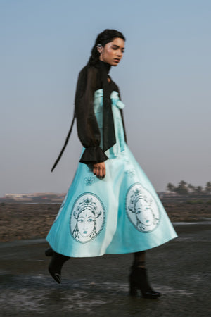 • Crafted in soft modal satin, this printed dress features a corseted bodice with a chic bow detail. The panelled flared skirt is supported by a cancan structure for volume, making it perfect for standout moments.