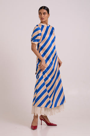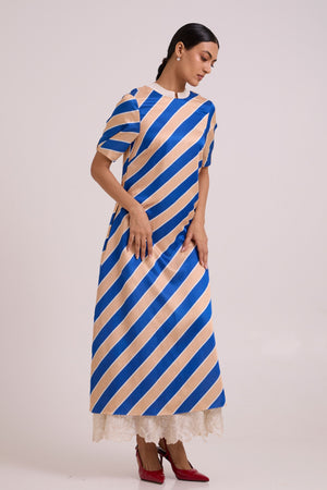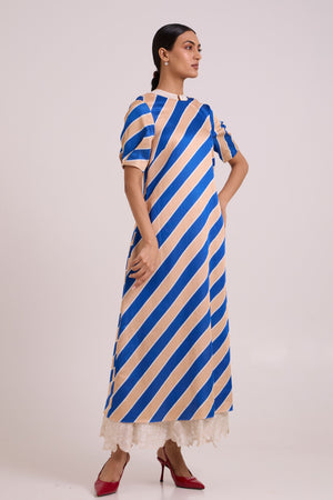 • A bold meeting of geometry and grace. The empress dress commands attention with its diagonal sapphire-and-sand stripes, softened by a whisper of embroidered lace peeking through the hem. Structured yet fluid, it moves with quiet confidence — made for days when you want your presence to do the talking.