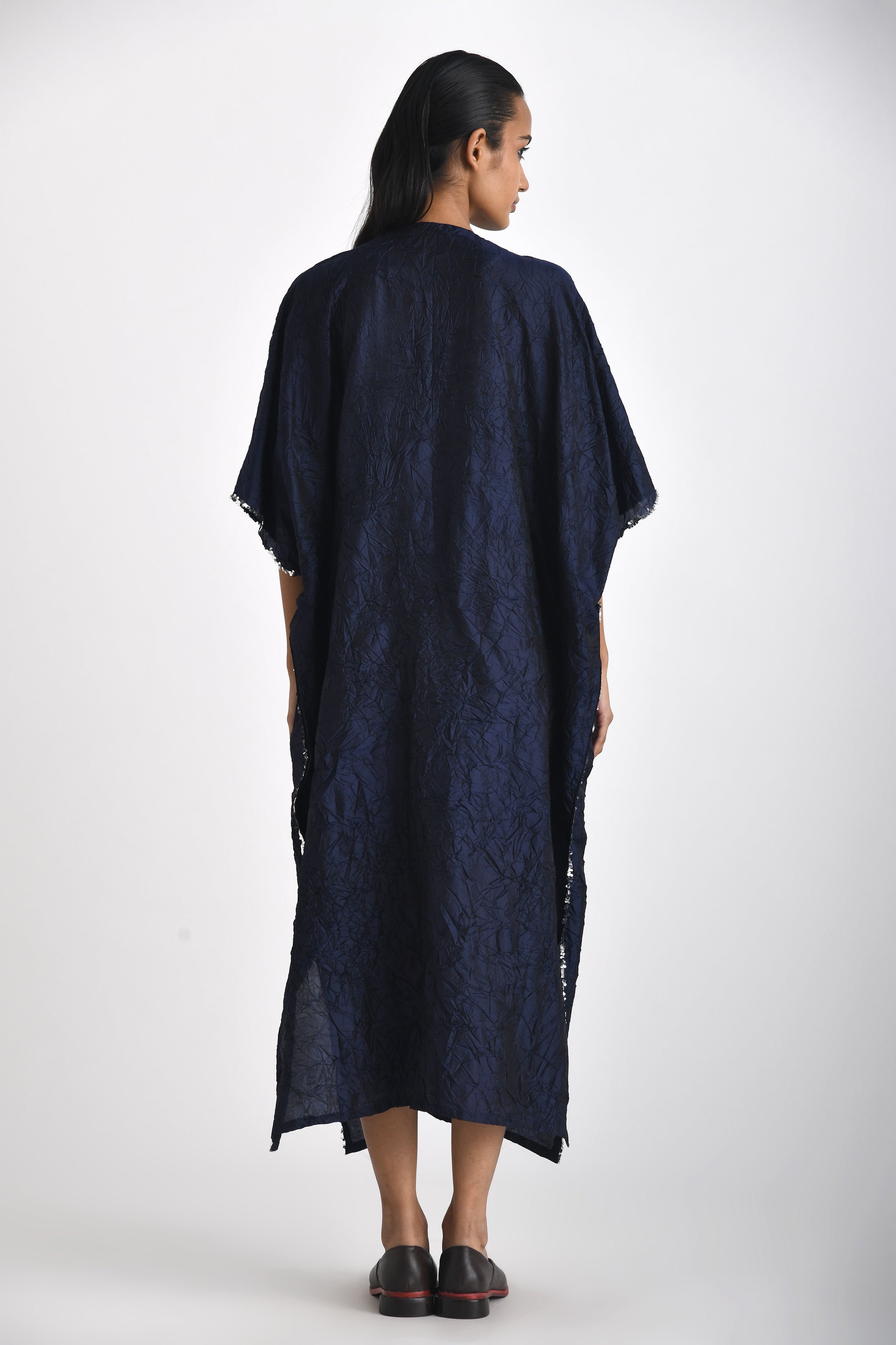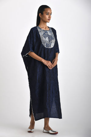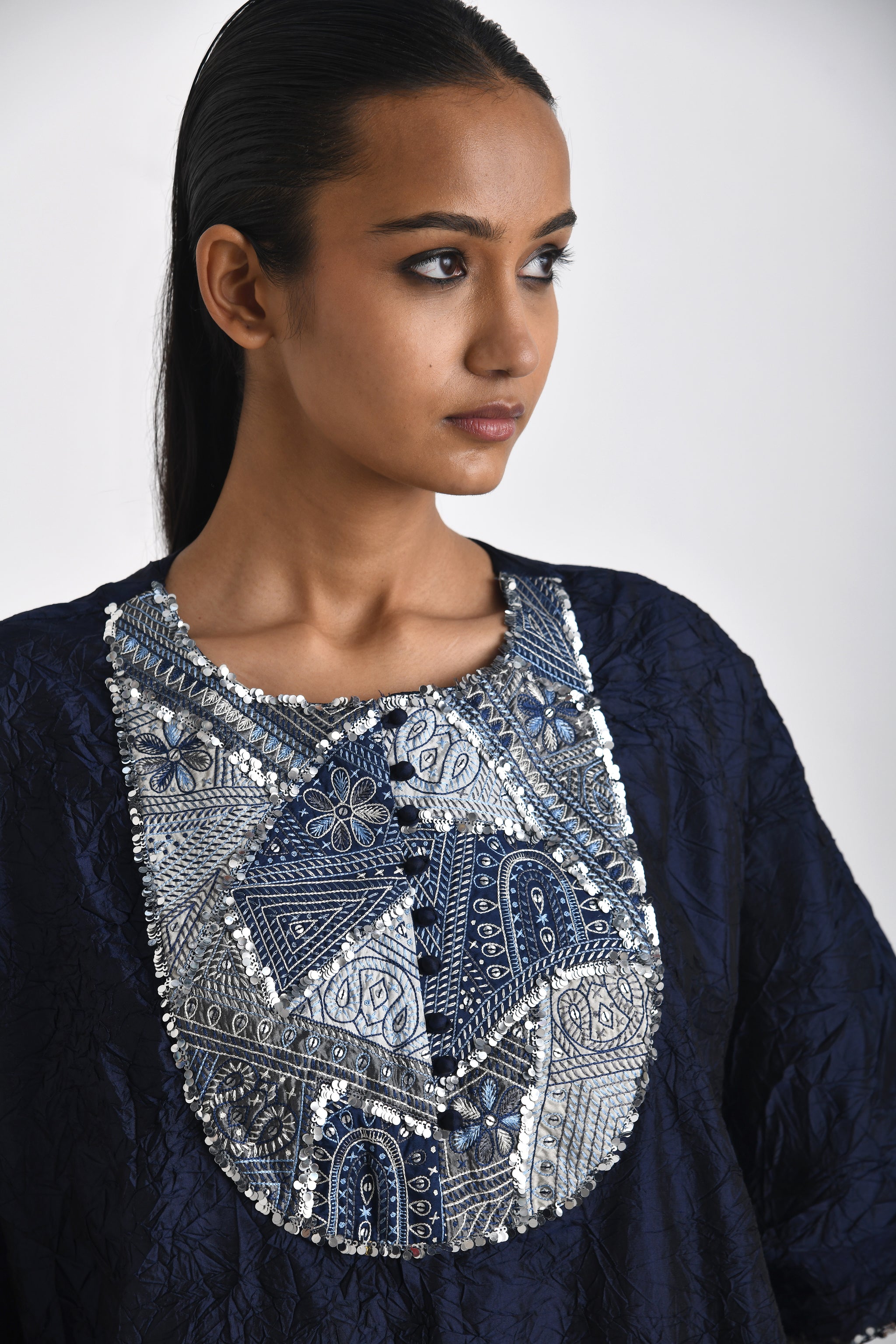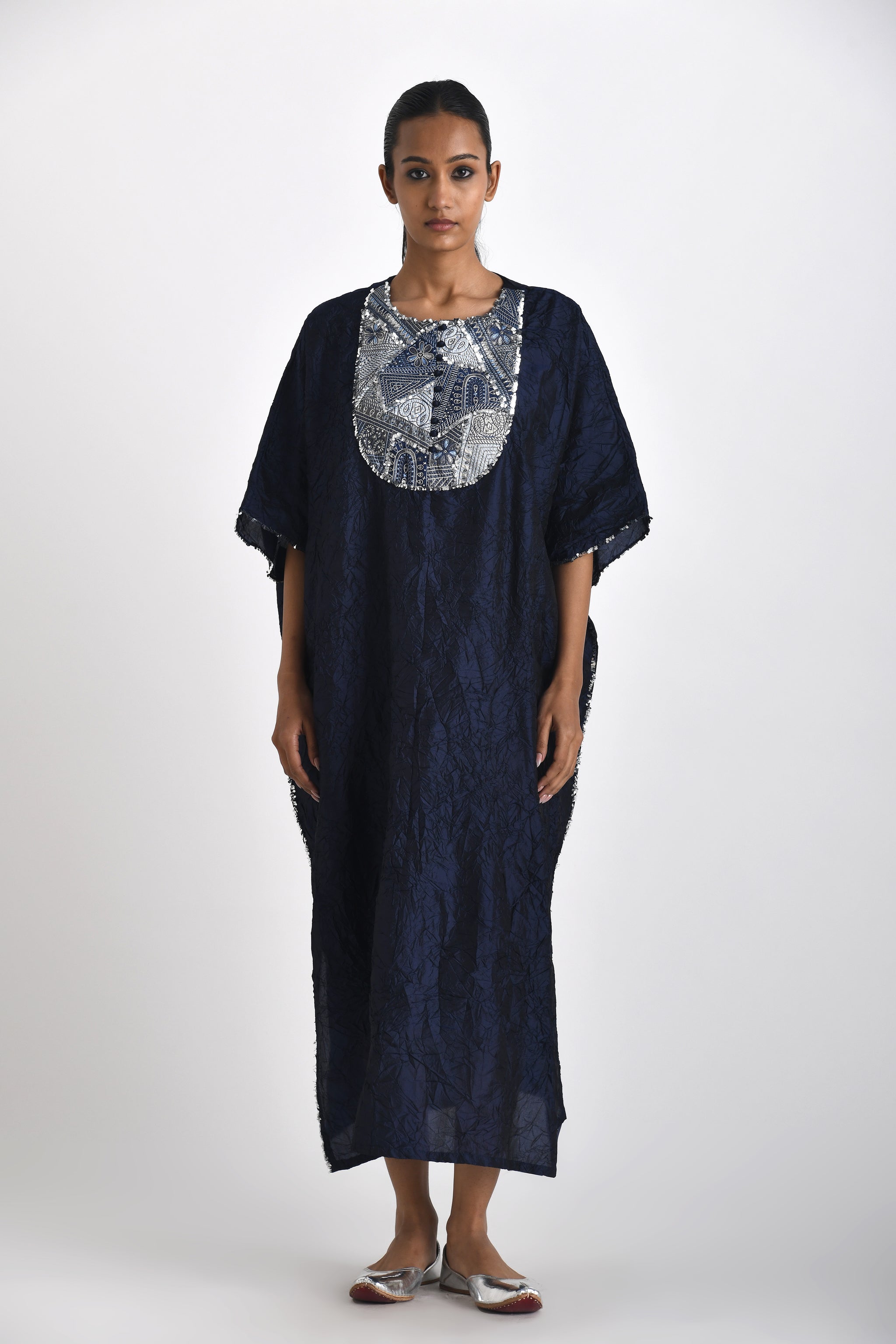 • Patchwork hand embroidered yoke, crushed silk kaftan, embellished with sequins along the neckline, sleeves and side seams. A glamorous look for that perfect holiday.