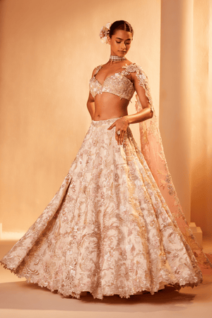 • Lehenga blouse and dupatta. Layers of thread and sequence floral work in pastel pink,gold,silver colors. Kalidaar lehenga blouse and dupatta with cutwork border in soft pink