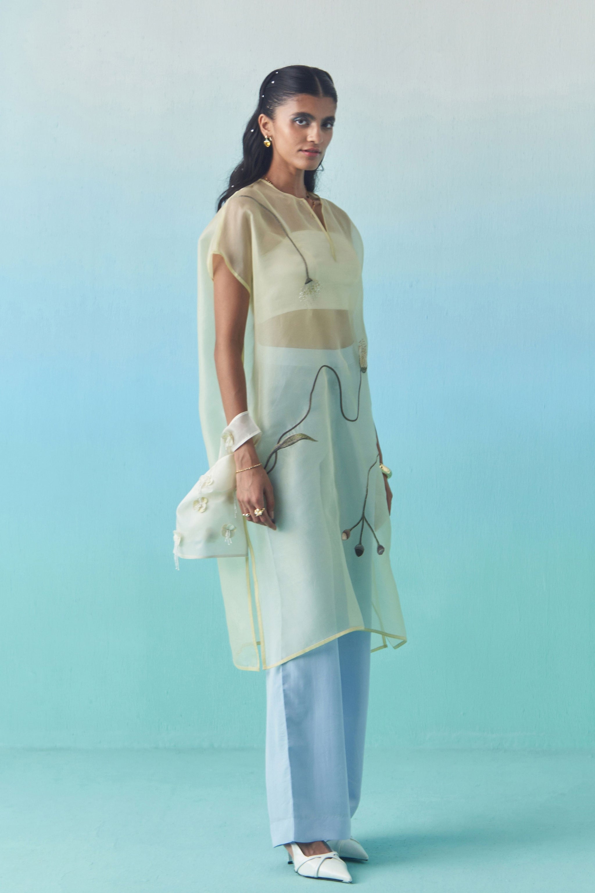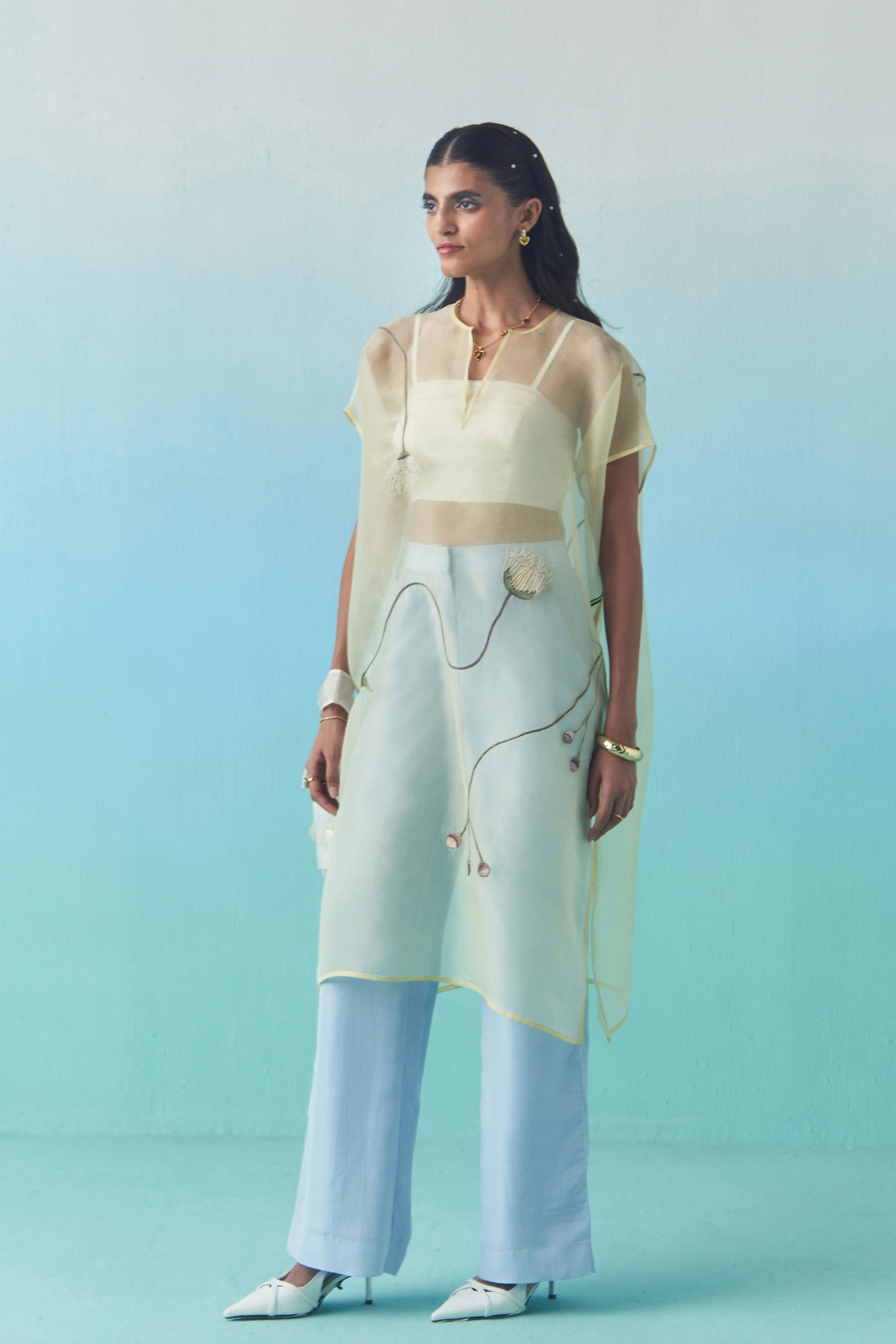 • A versatile, free-size sheer kaftan overlay with hand embroidered contemporary motifs at the front and back. Comes with an option of either a long camisole or a bustier inside.