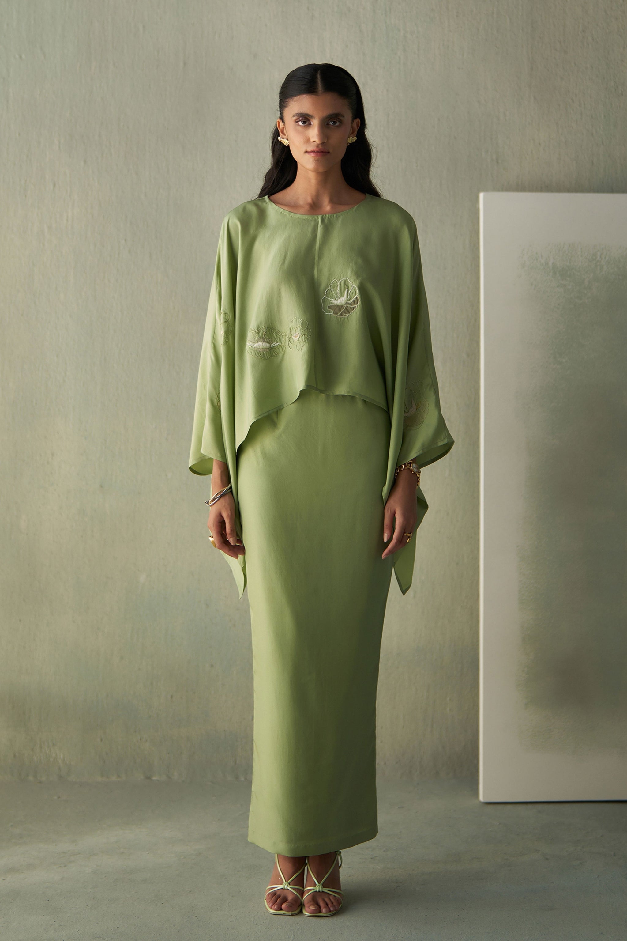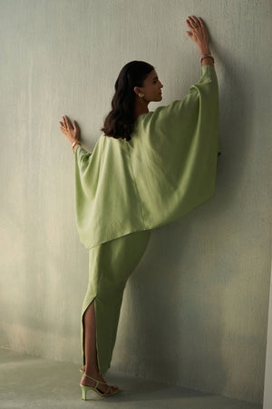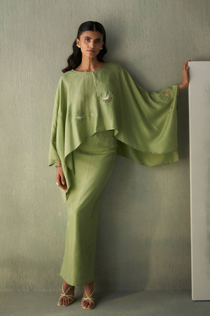 • Crafted in luxurious silk, this coordinated set features a fluid draped top with soft batwing sleeves and delicate hand-embroidered floral motifs. Paired with a straight-fit skirt detailed with a back slit, it exudes understated sophistication and graceful movement — making an effortless, modern statement.