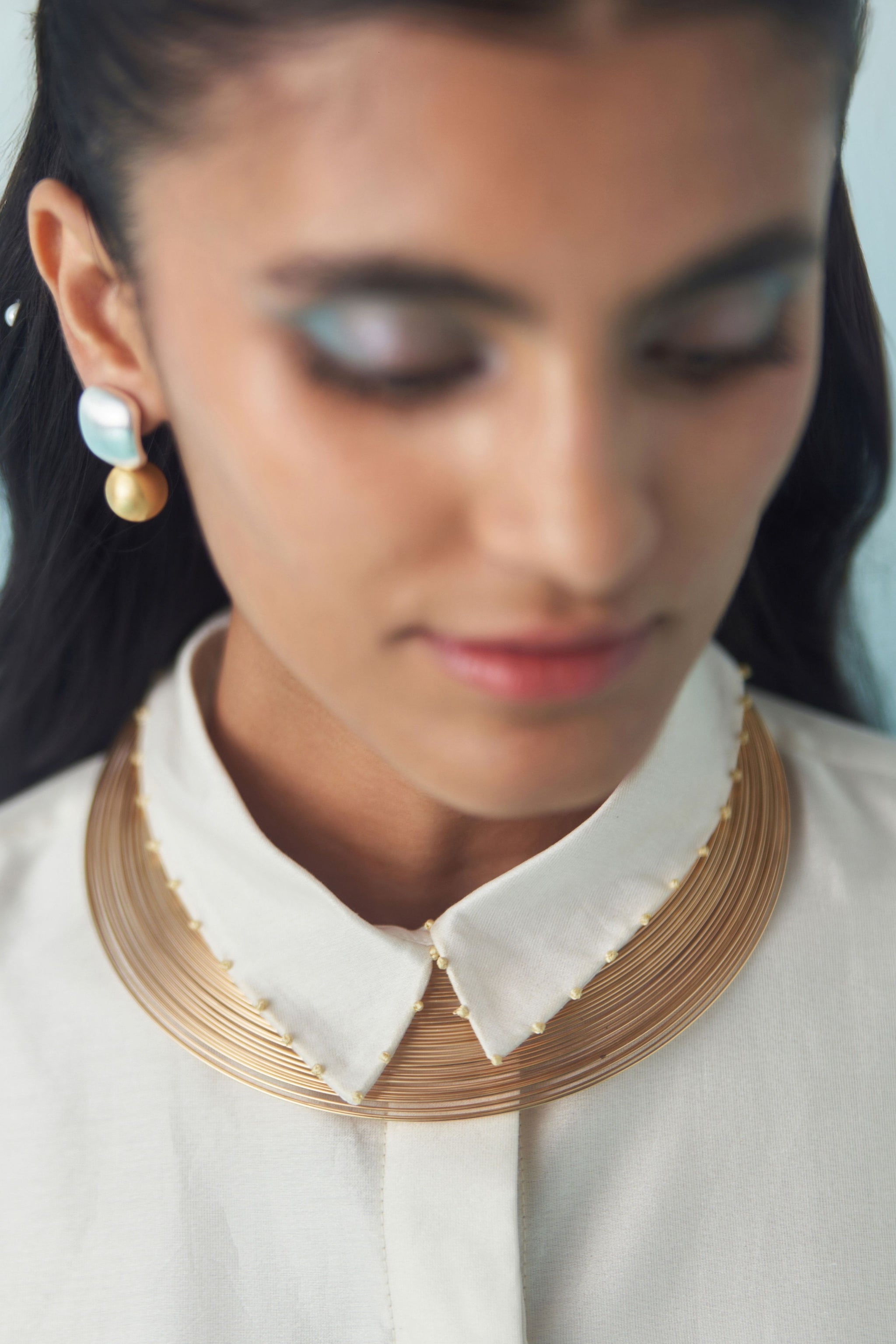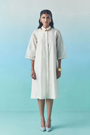 • A classic shift dress in off white that can even be styled as a kurta. It features french knot details on the collar