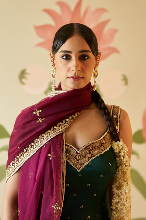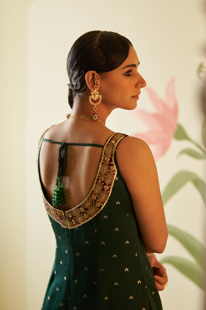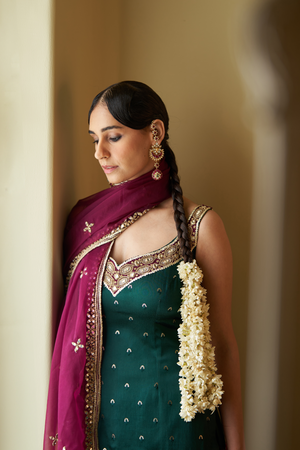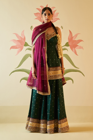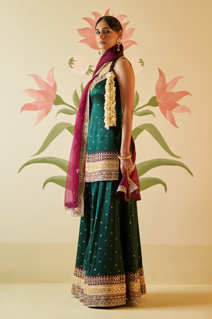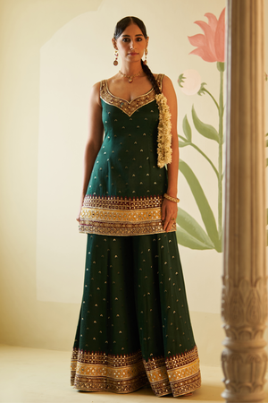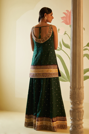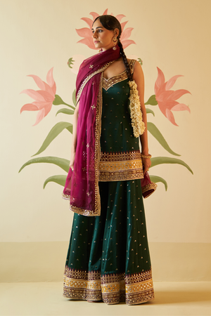 • Featured here is a hunter green satin silk sharara set embroidered with gotta patti and mirror work encrusted with rose gold zari.