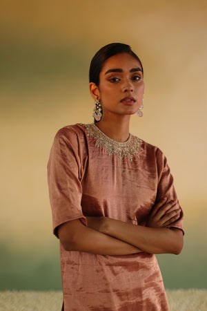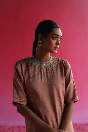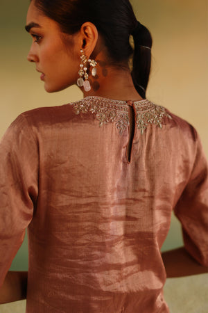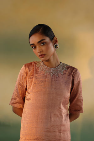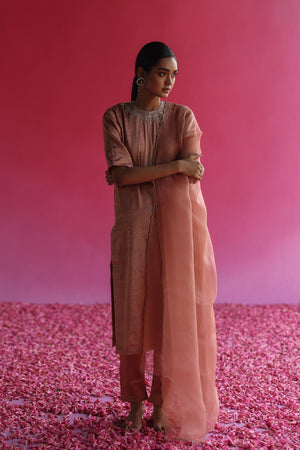 • A pure zari tissue silk straight kurta with elbow sleeves having an etherial antique zardozi hand embroidery along the neckline is paired with a pure zari tissue silk straight pants having a side closure. To complete the look, there is given a pure organza silk delicate dupatta with intricate zari scallops as a border.