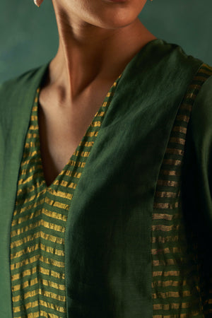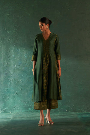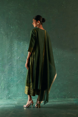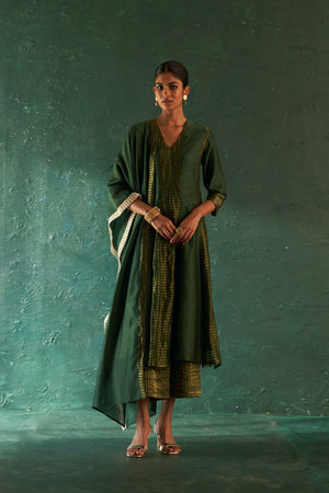• Designed with alternated solid and stripes panels in chanderi and tissue fabric, this contemporary anarkali kurta set is a perfect style for a dressy look. Paired with stripe panel pants and matching dupatta, this designer ensemble is ideal for your festive celebrations.