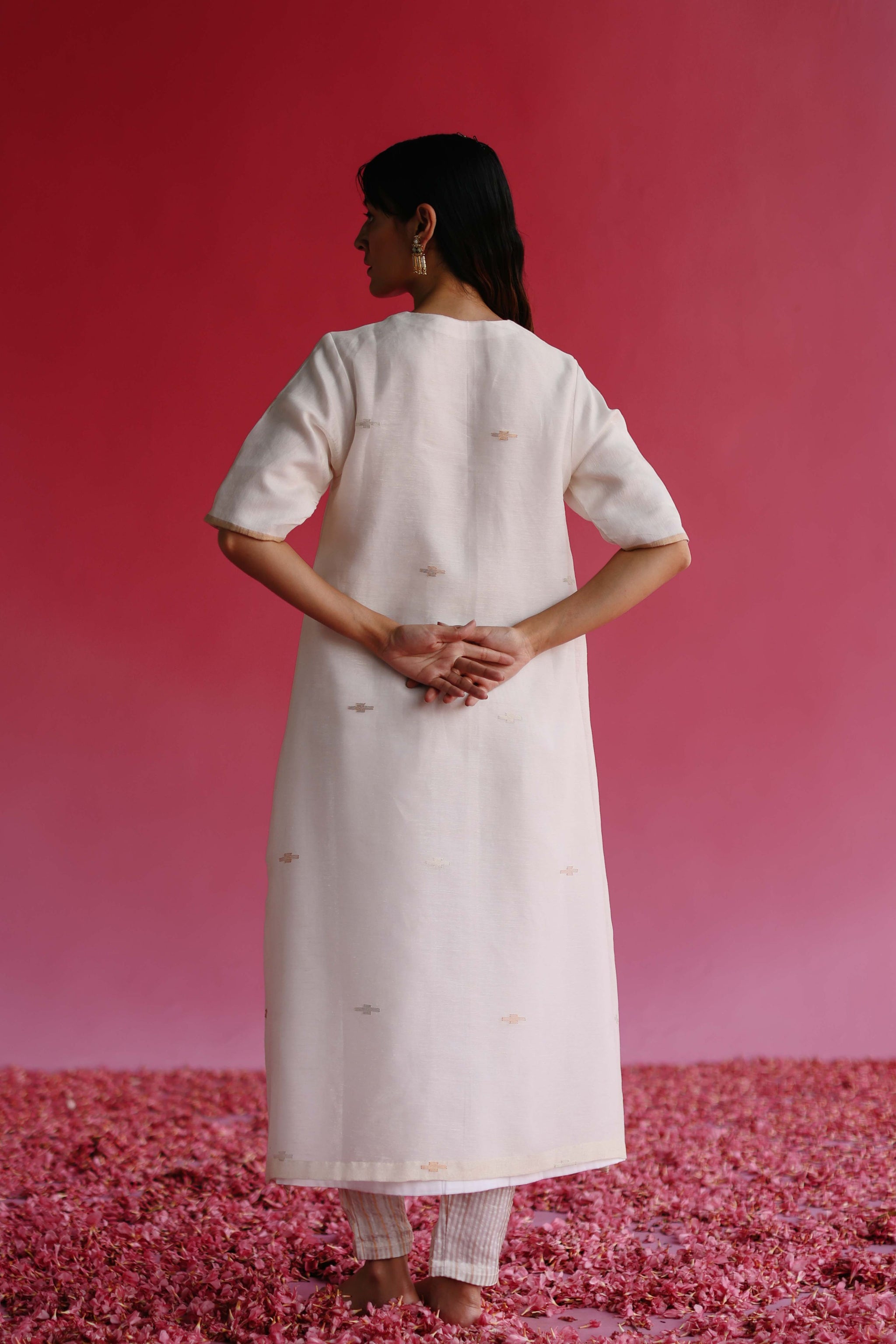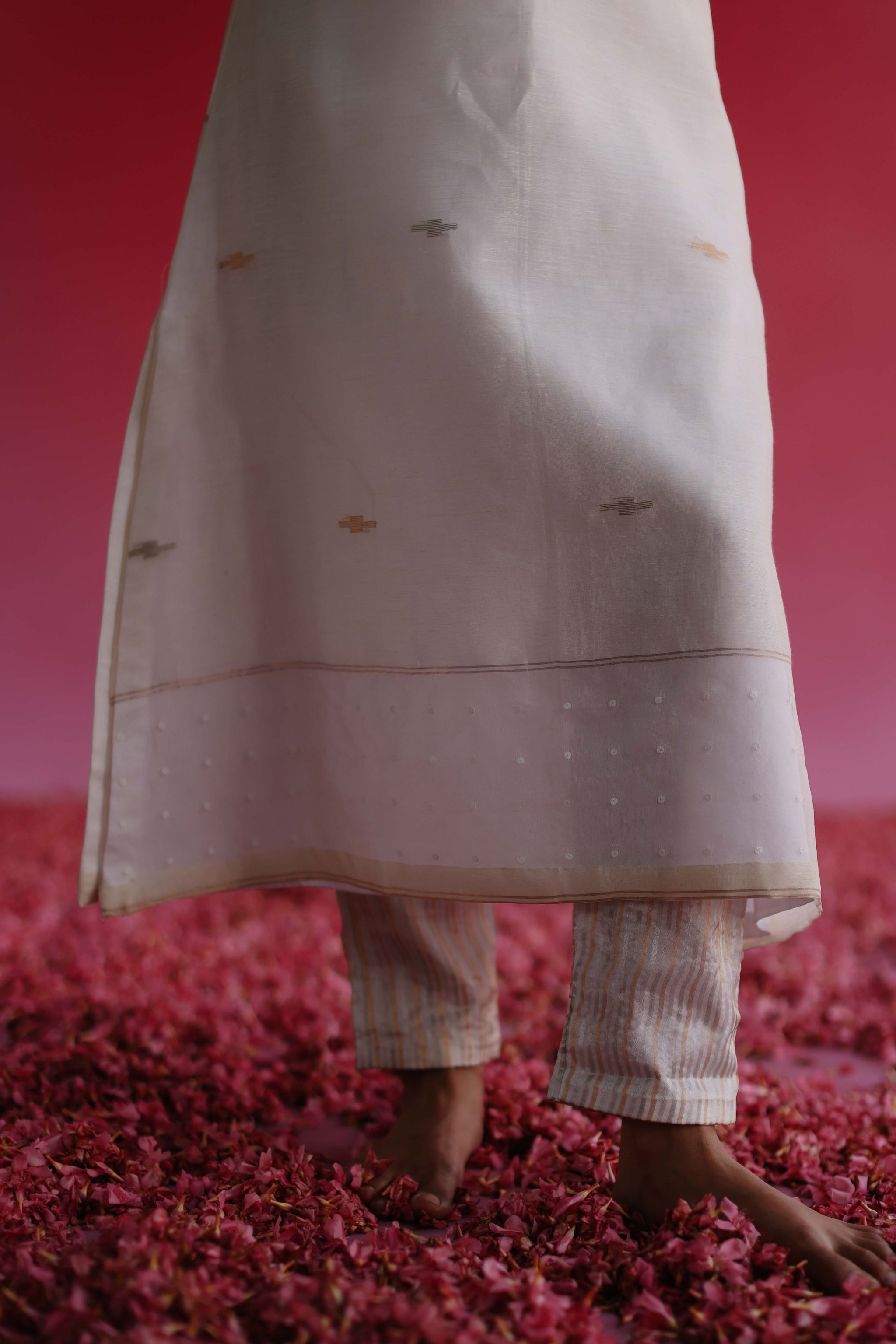 • A pure linen silk handloom traditional jamdani weave fabric elbow sleeve a-line kurta having a pure zari woven border on the sleeves and delicate detailing on the daaman. The kurta is complemented with a pure sheer gold-silver stripe zari tissue silk straight pants with a side closure. To complete the look, there is given a pure handloom traditional jamdani zari weave fabric dupatta with handmade tassels.