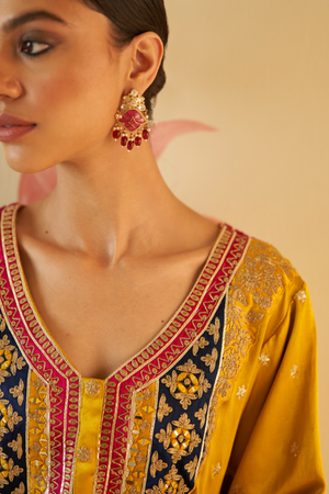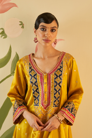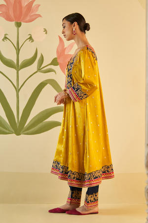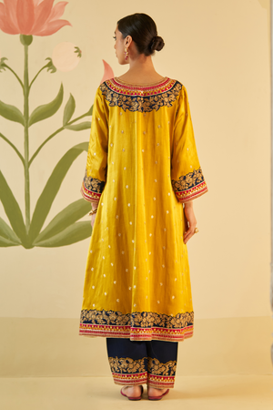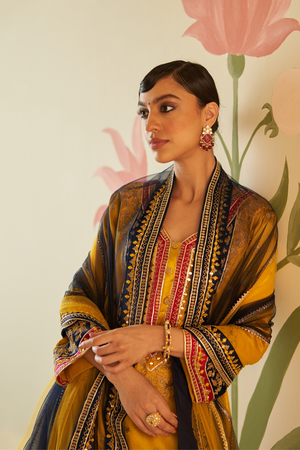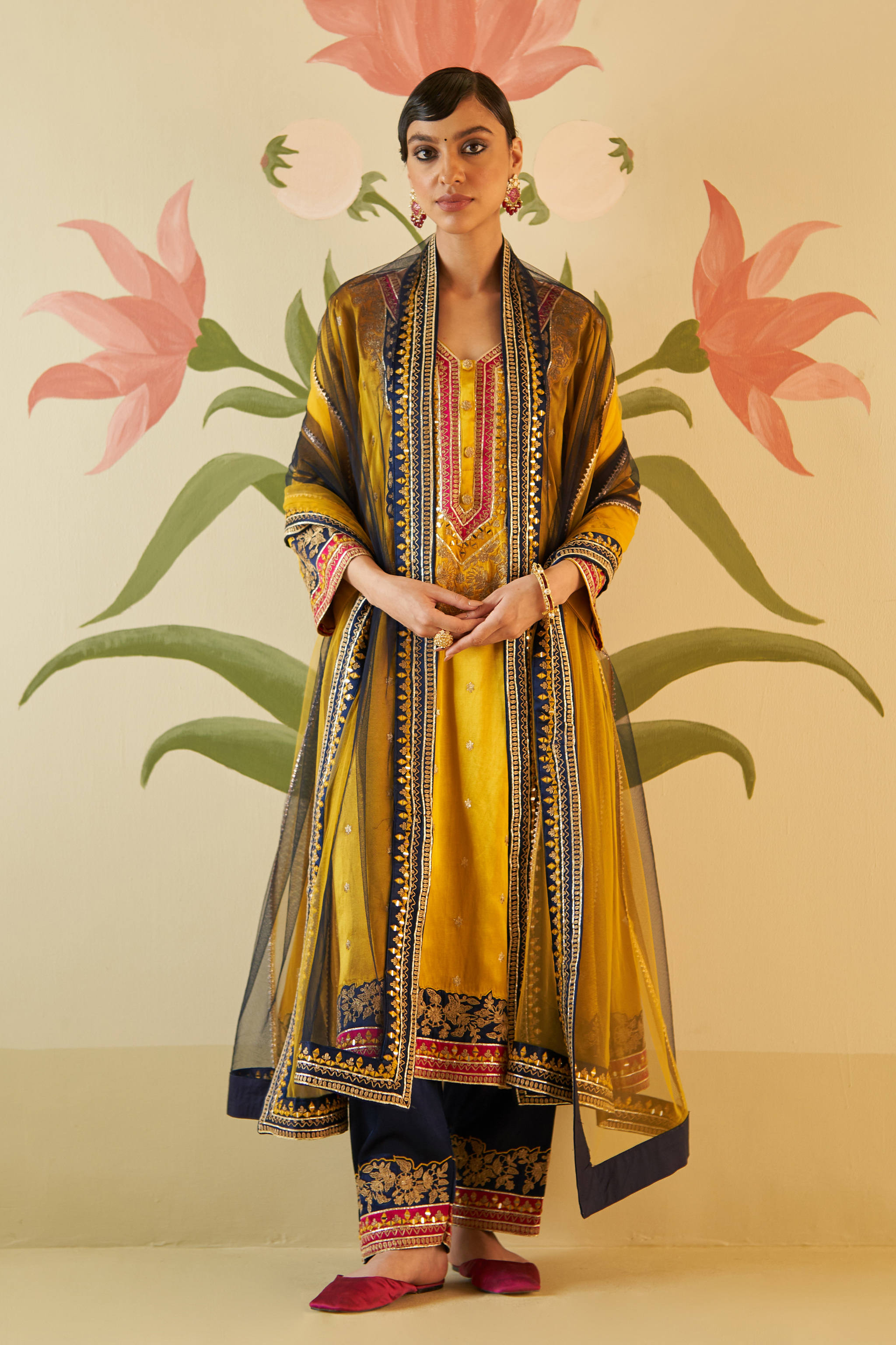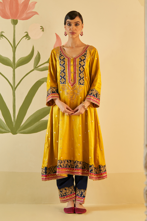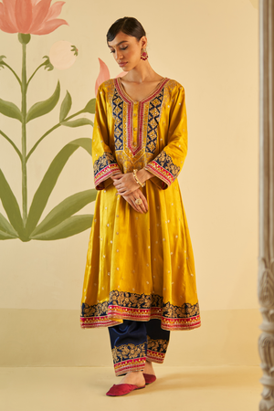 • Featured here is a mustard yellow choga set embroidered with midnight blue applique embroidered with mirror work encrusted with tonal silken threads and rose gold kasab.