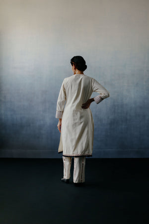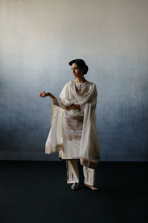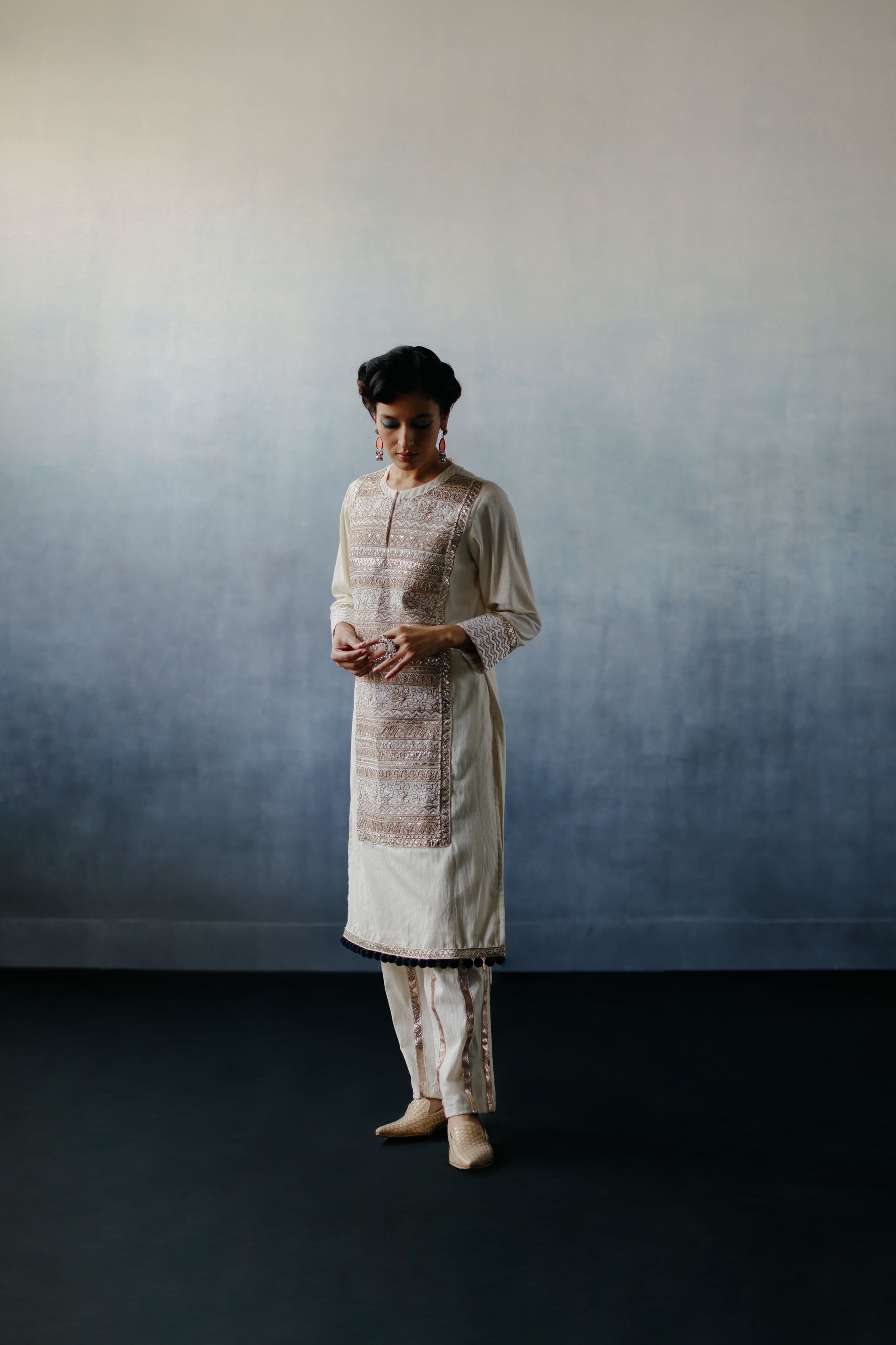 • Handloom cotton matka silk kurta features a big panel in dori and resham work. It is paired with chanderi dupatta with heavy zardosi work border . It has pants with liner gota lines in the same cotton matka silk fabric.