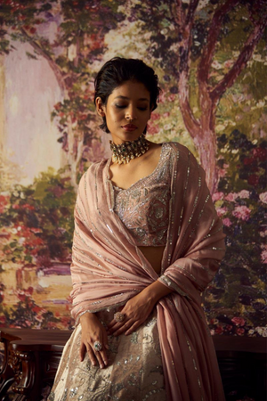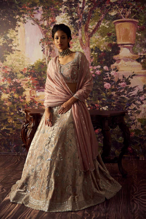 • Beige velvet embroidered lehenga, onion pink elbow sleeves embroidered blouse with semi silk dupatta set
