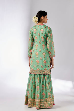 • This pretty ensemble in our floral jaal , with an intricate border embroidery. The short tunic with matching dupatta embroidered in sequins and gold thread, and voluminous sharara adds a feminine grace.