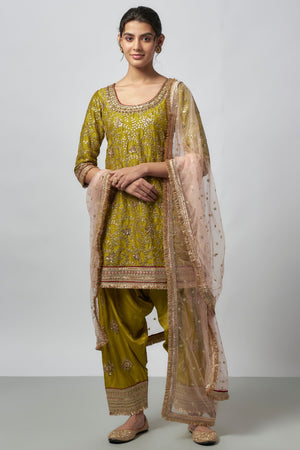 • This ensemble features a knee-length,round neck kurta with intricate hand embroidery highlighted by delicate sequin and thread work. Paired with matching dhoti-style pants and net dupatta with shimmering details and a beautifully crafted border.