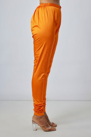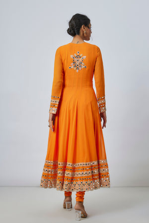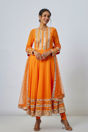 • Featuring classic orange anarkali. Intricate mirror work and embroidery adorn the neckline, cuffs, and the hemline. Paired with churidar and net dupatta with scattered mirror motifs completing the look.