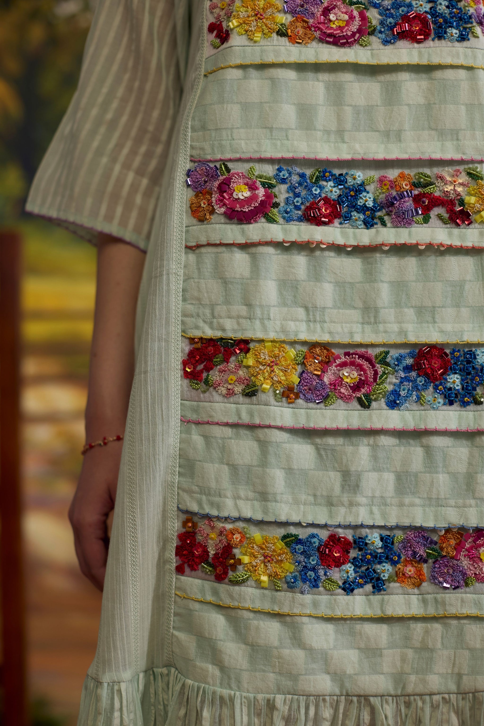 Care: Dry Clean Only. As garments are handmade and handwoven, natural variations in colours and weaves are a characteristic of the textile, and may be found in the finished garments as well.