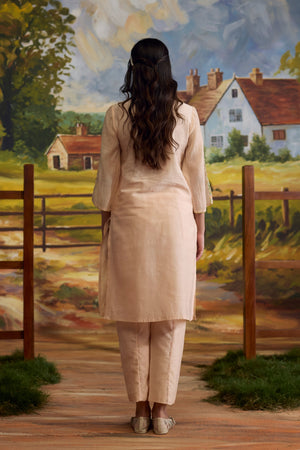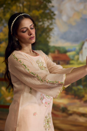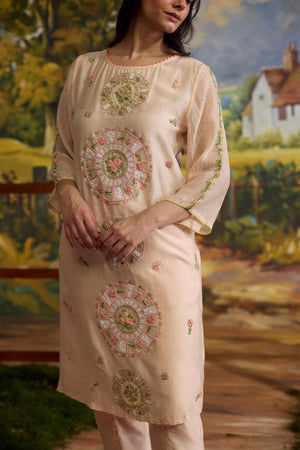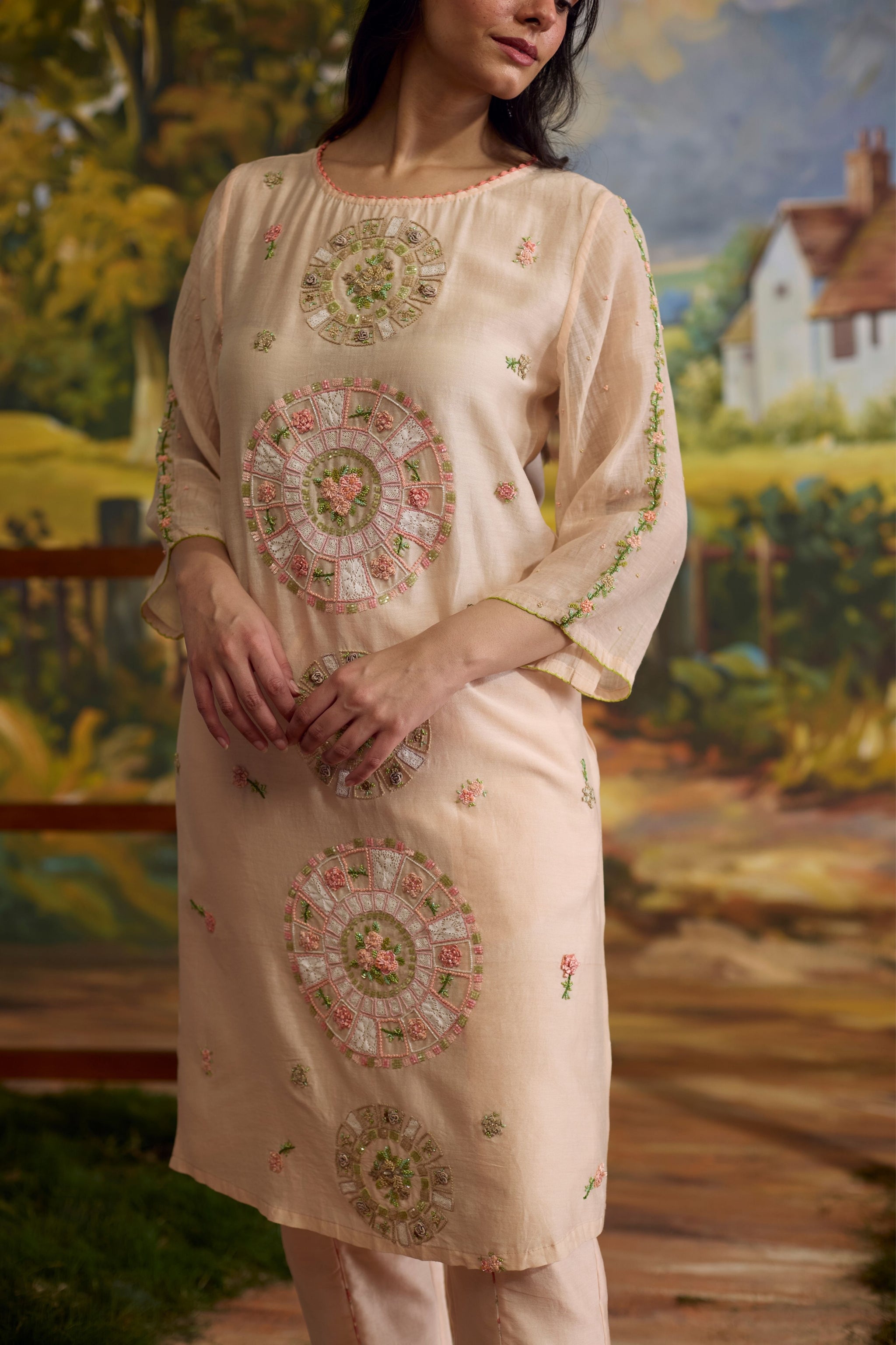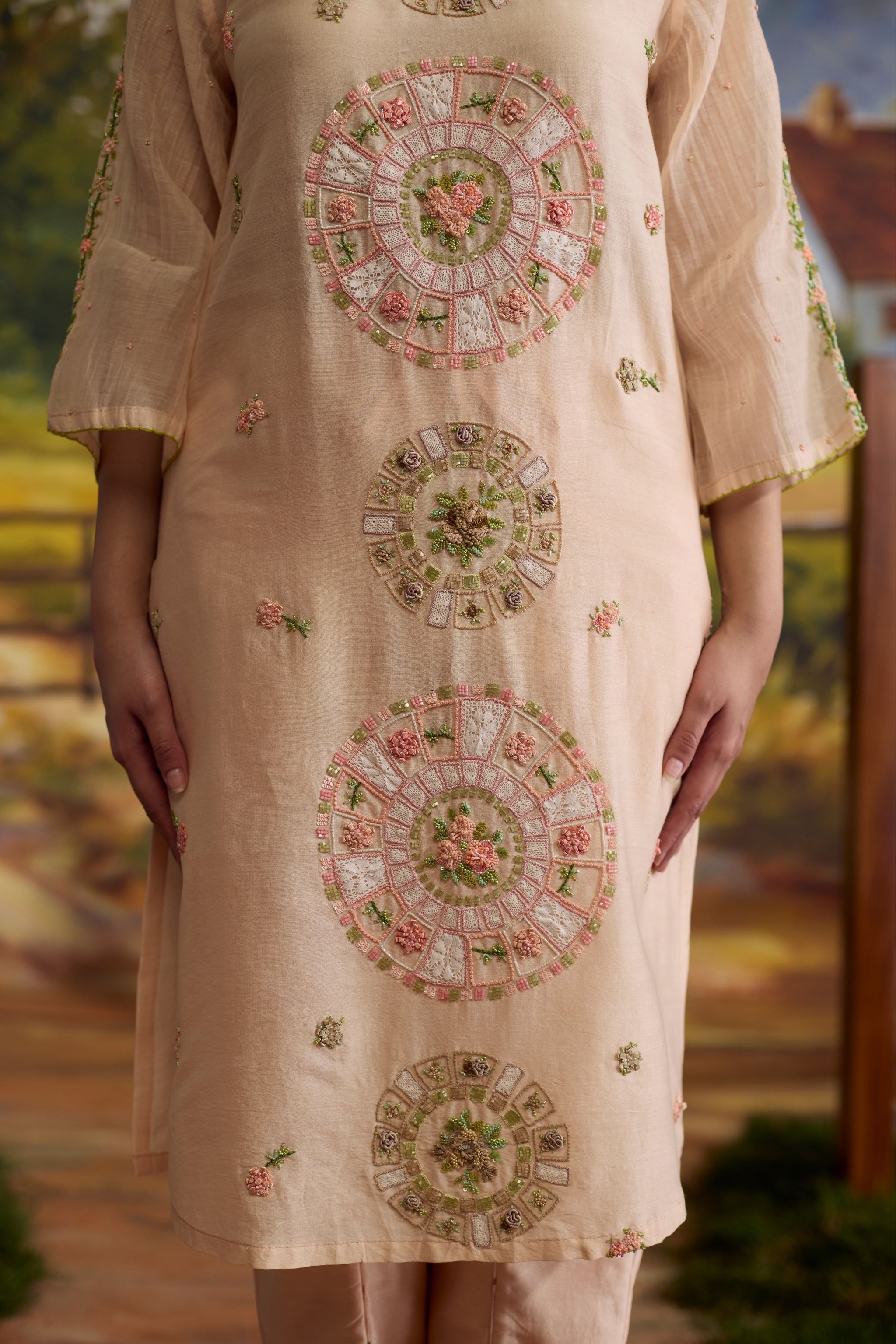 • The sorbet floral beaded kurta, made in fine chanderi, features a blend of beaded geometric forms and floral motifs, edged in lace. The front carries these delicate details, while the bell sleeves are lightly touched with beaded accents. A soft, flowing silhouette perfect for sunny afternoons. Complete the look with the sorbet straight pants—crafted in fluid chanderi with a straight-leg cut that drapes gently. A breezy separate that complements the kurta’s easy elegance.