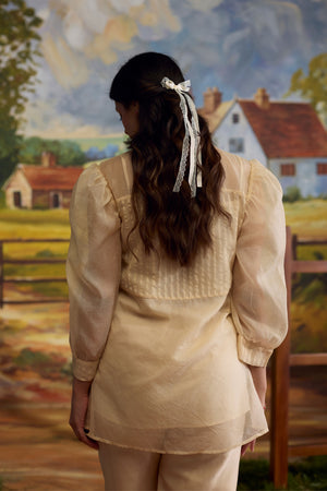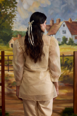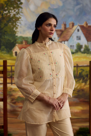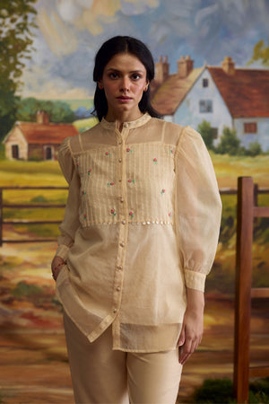 • The sorbet organza top, crafted in a blend of chanderi and organza, features puff sleeves with textured striped cuffs. Embroidered floral accents are scattered across the front, complemented by an attached shimmering detail for a touch of elegance. Pair it with the sorbet cuffed pants, crafted in linen, featuring chic cuffs that enhance the effortless elegance of the look.