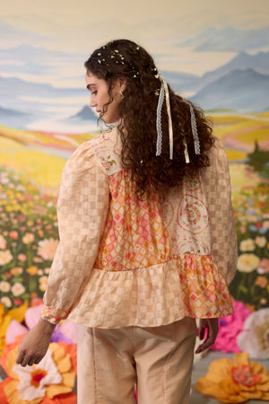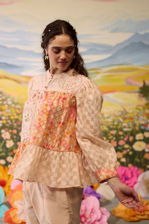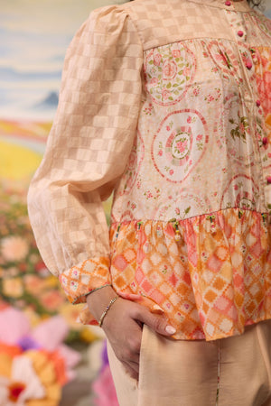 • The sorbet printed shirt is a breezy, button-down piece crafted in a lightweight blend. It features a checkered base with floral and geometric patch panels, while voluminous sleeves and a gathered waist create a relaxed, flattering fit. The delicate contrast buttons add the perfect finishing touch. Pair it with the sorbet straight pant crafted in chanderi for a coordinated look that exudes effortless charm. The pants offer a sleek, comfortable silhouette to complement the top’s flowy design.