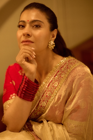 • This elegant saree features a luxurious drape crafted in a sheer, lightweight fabric with a subtle sheen, beautifully enhanced by an intricately embroidered border. It is paired with a contrasting rich red blouse adorned with delicate motifs, adding a regal charm to the ensemble.