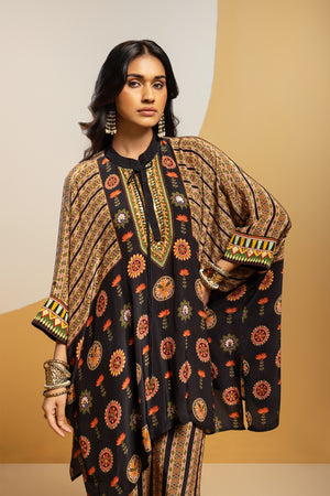 • Black taarani embellished kimono kurta with neck tie-up, paired with printed pants in crepe.